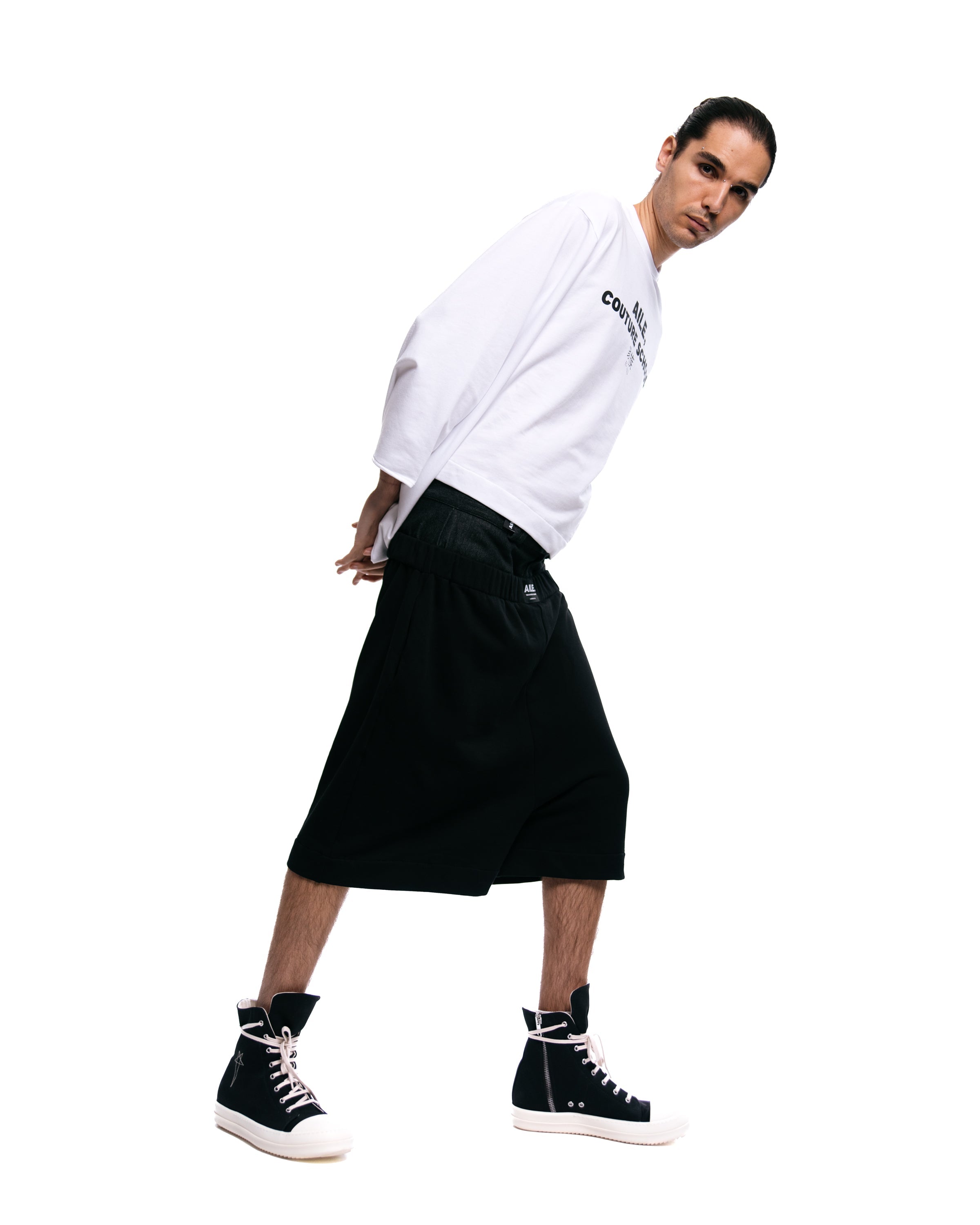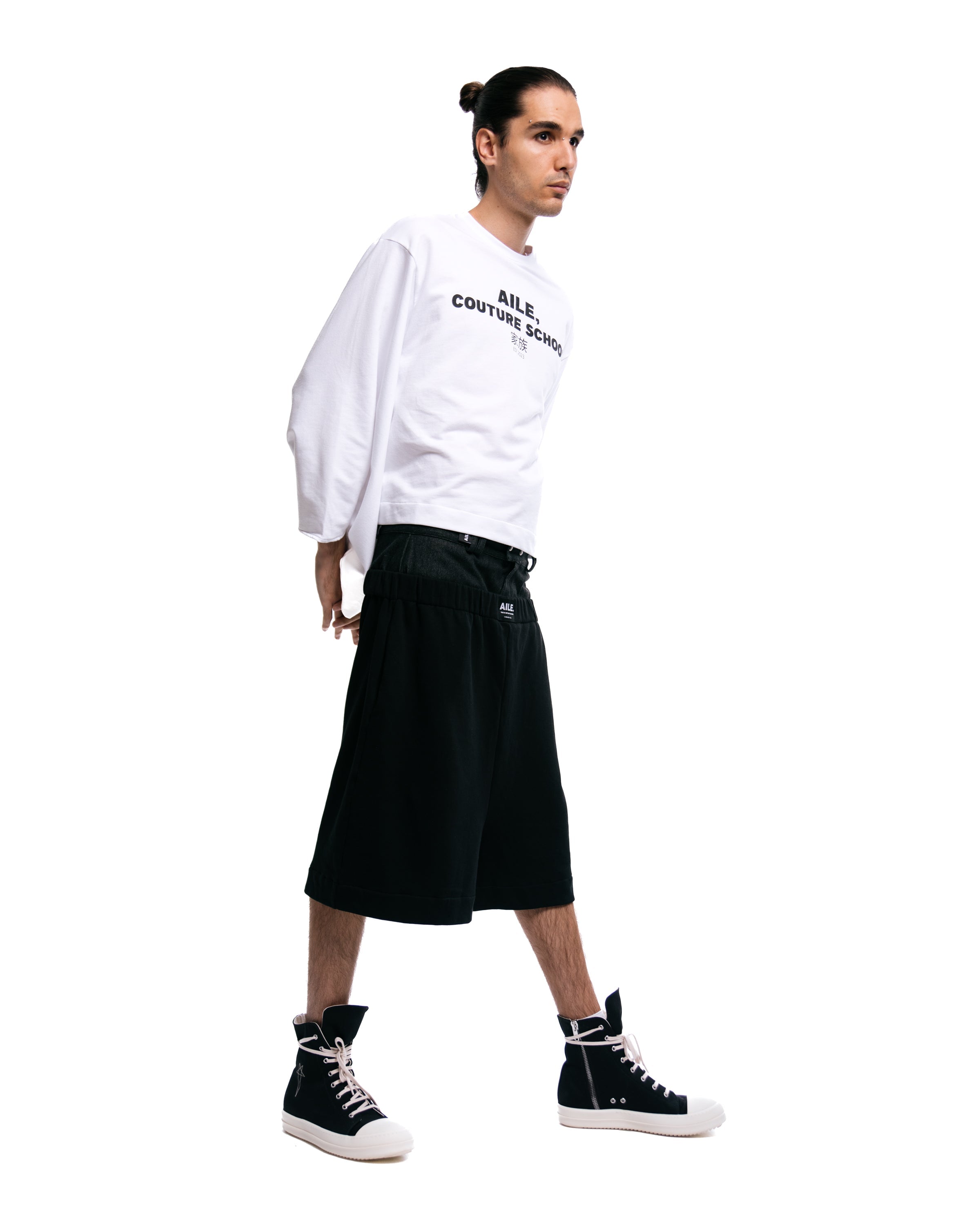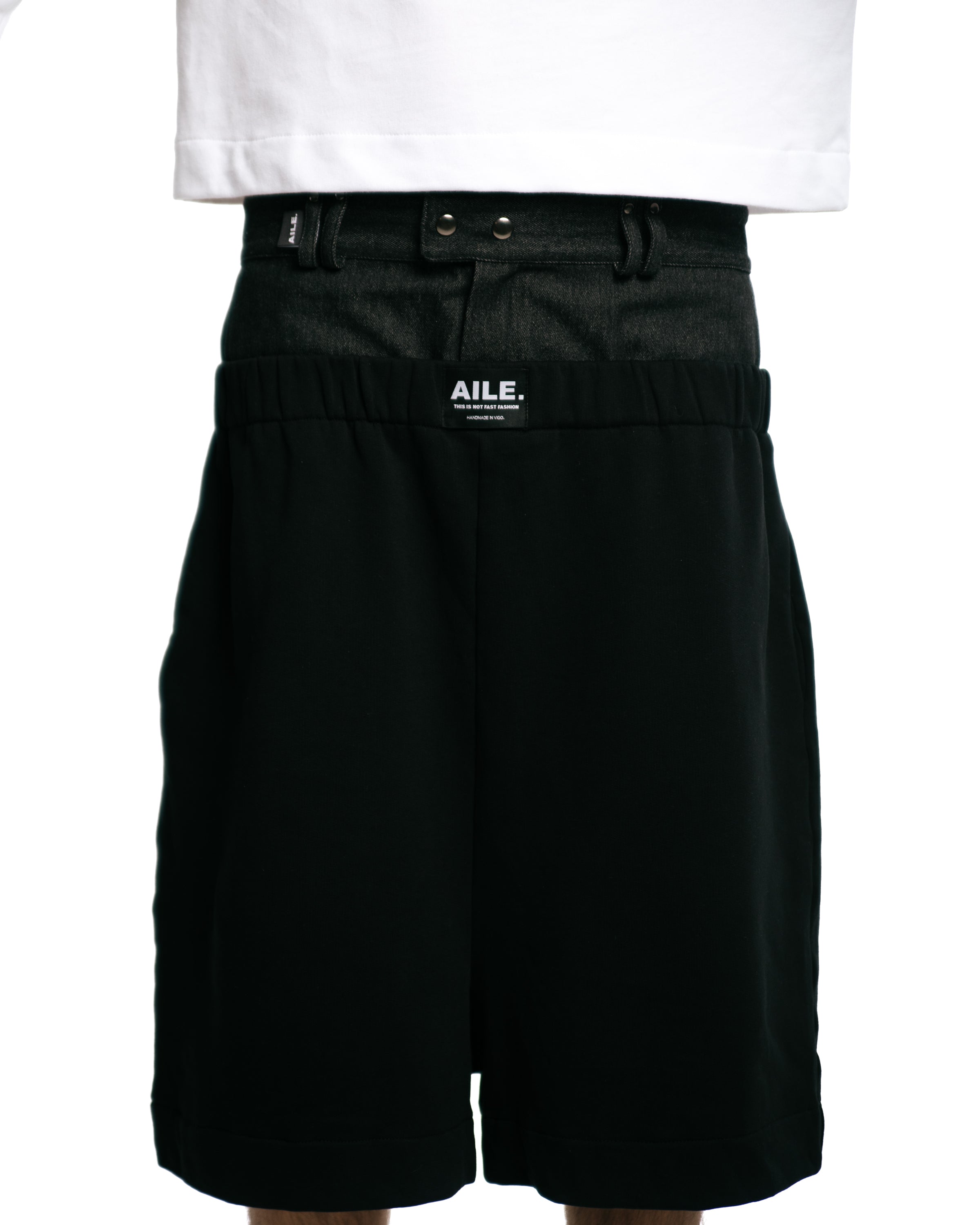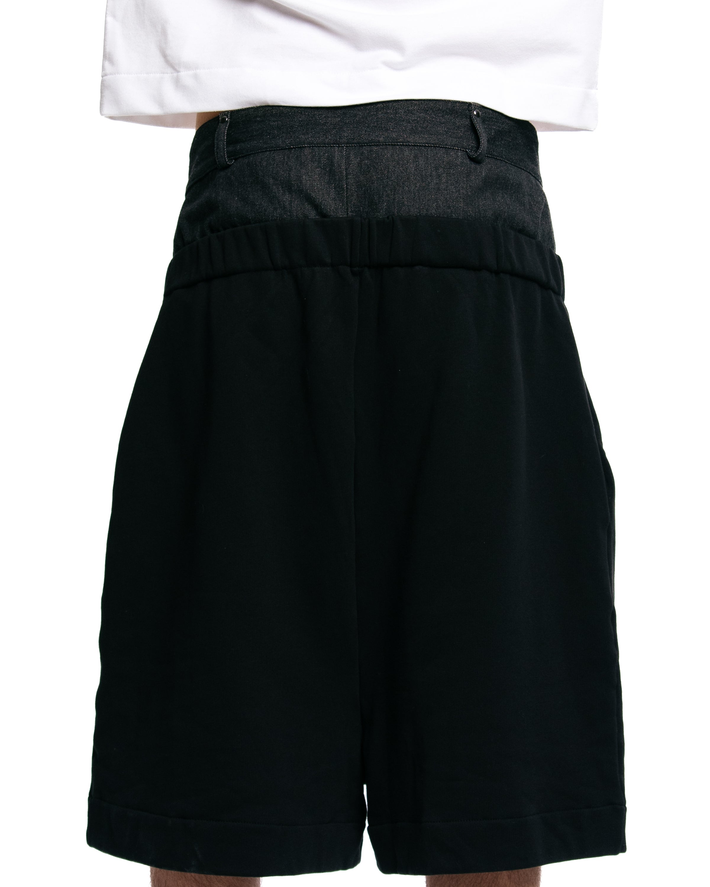Jersey short sweatpants in color black with double denim waistband in black.