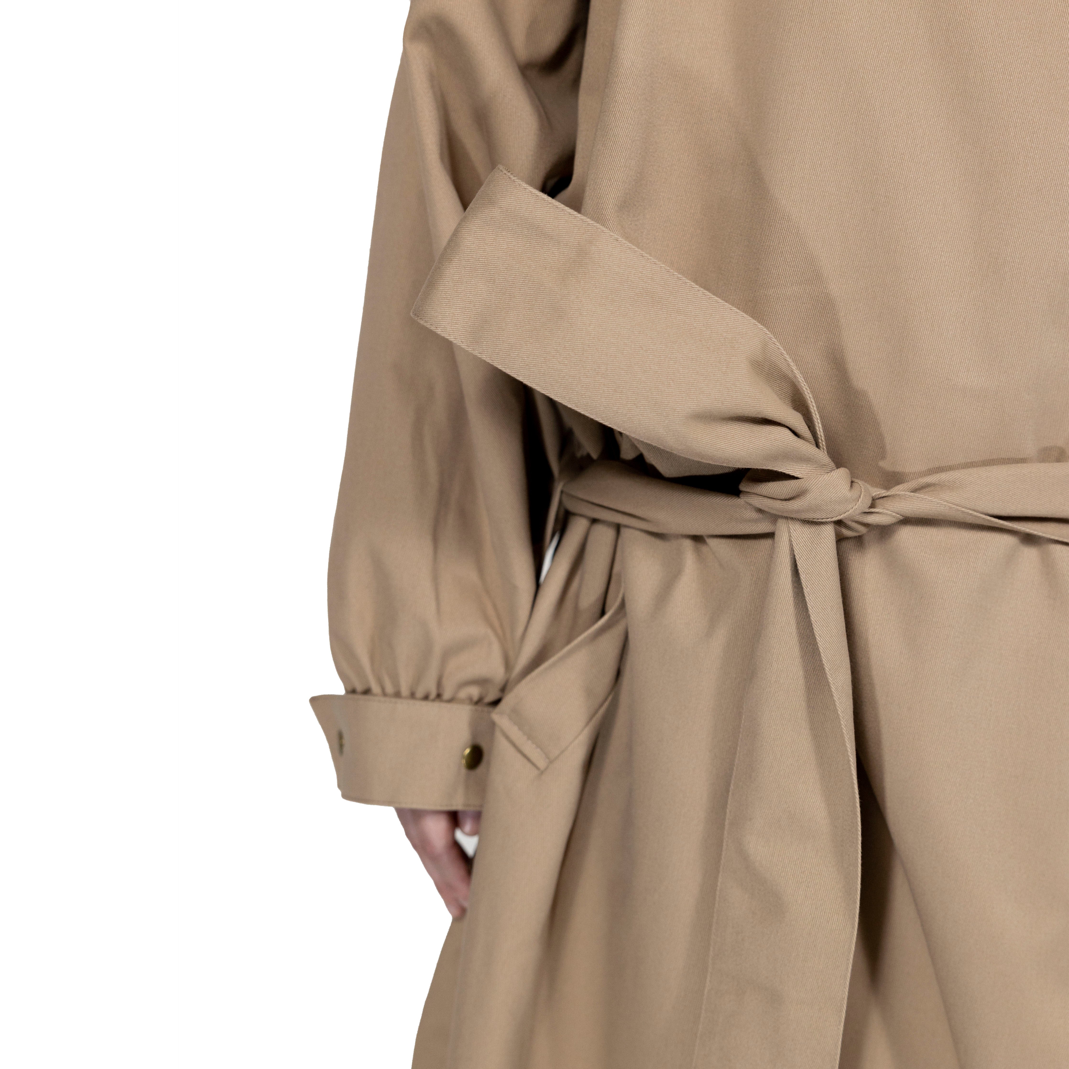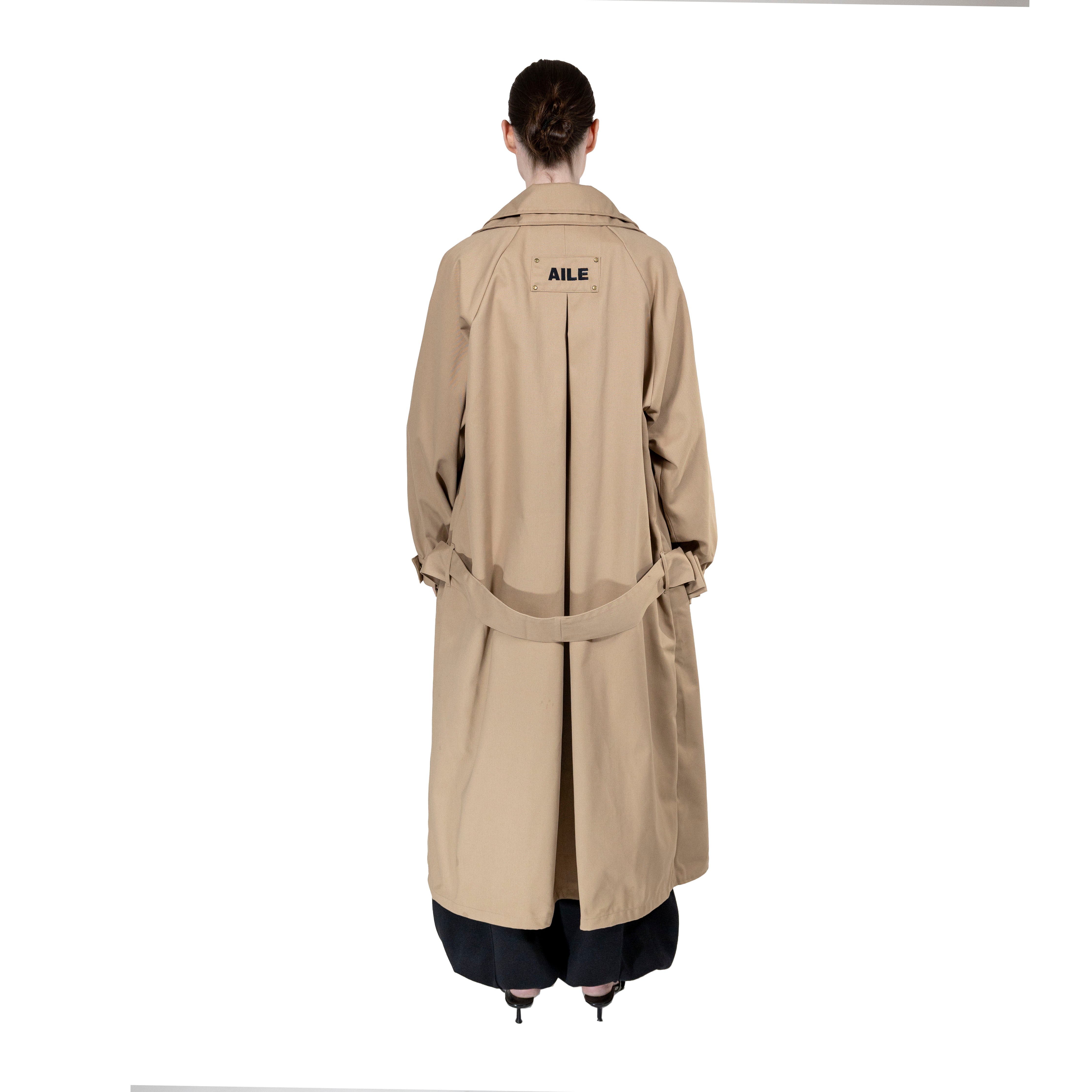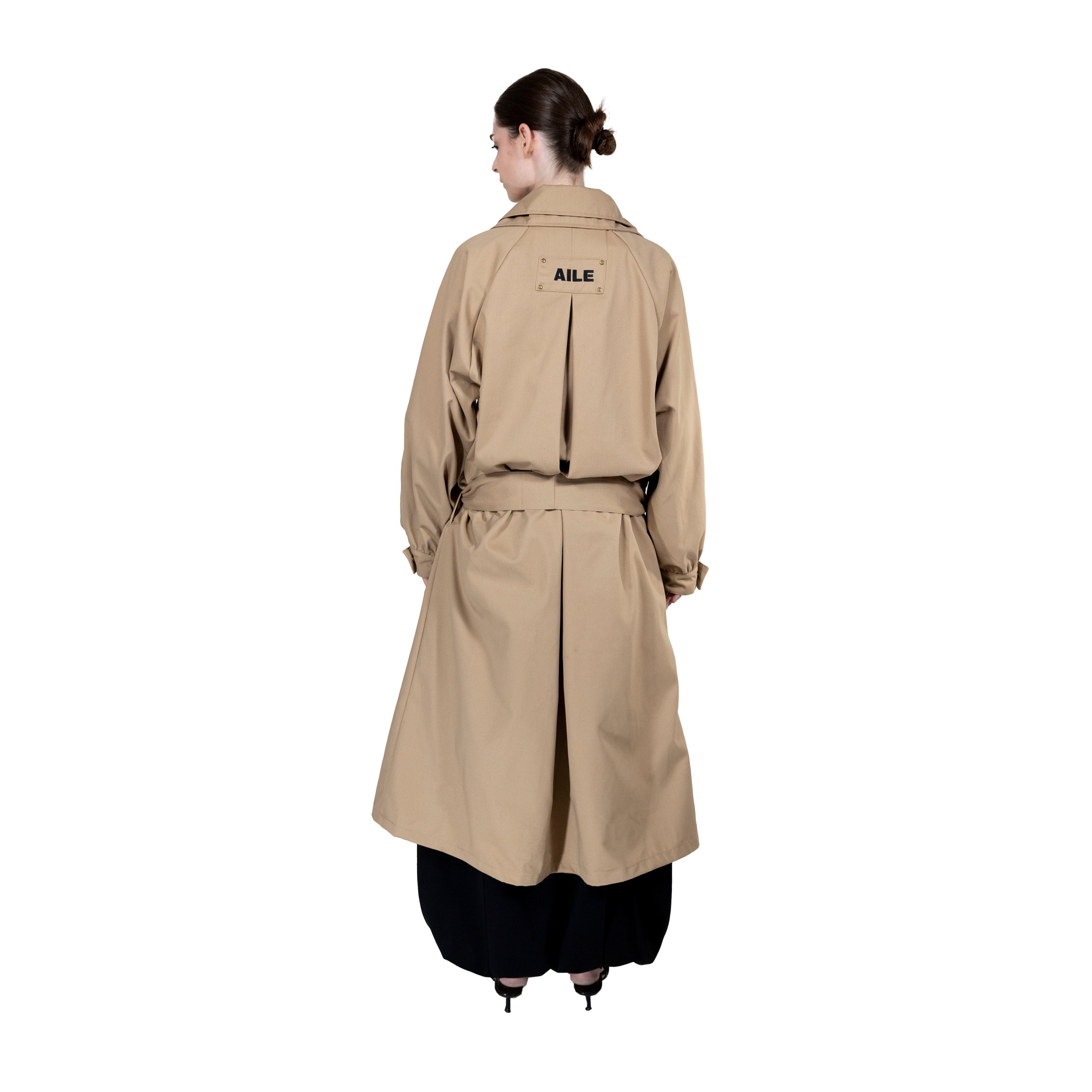 Beige long trench coat with adjustable sleeves and embroidered pleat on the back.