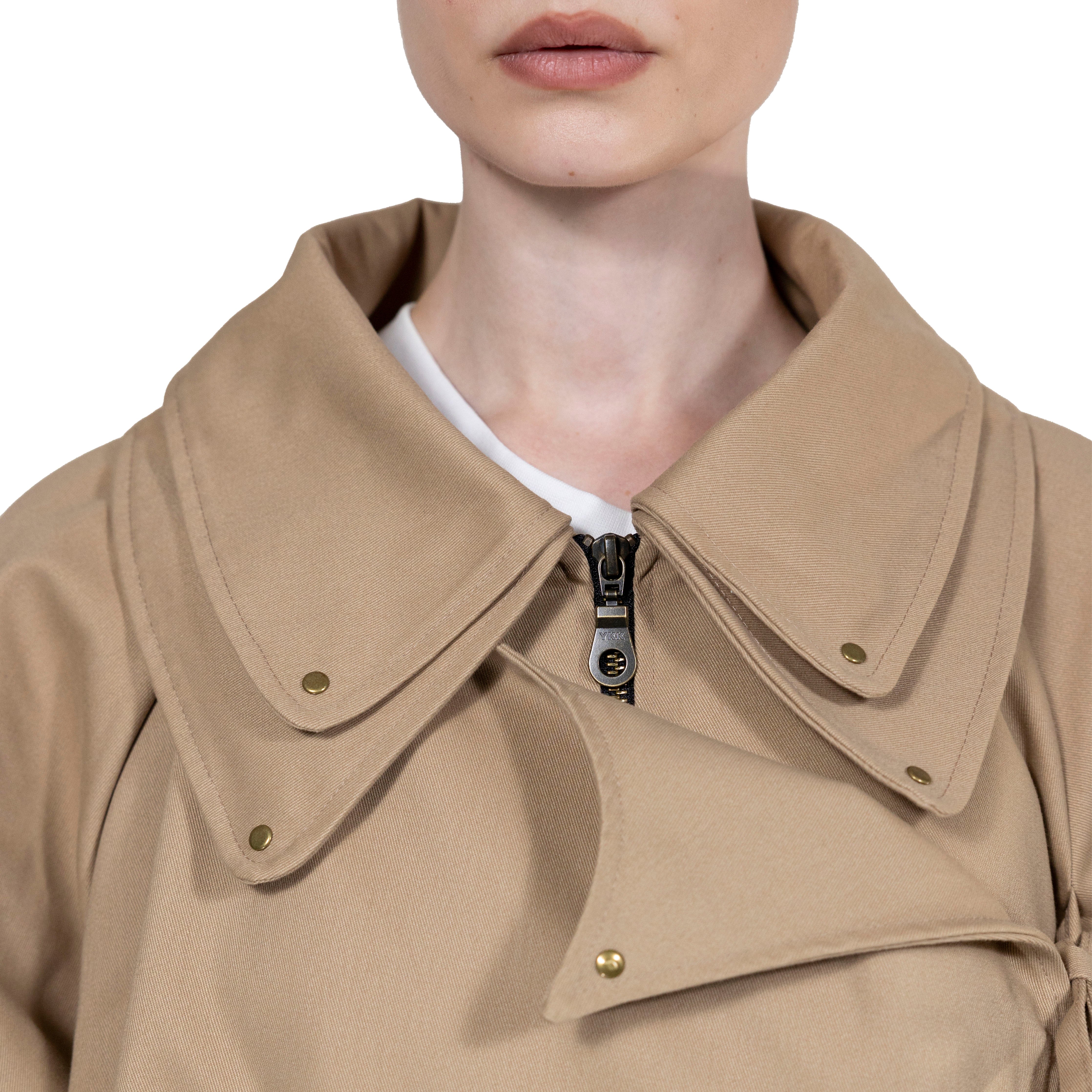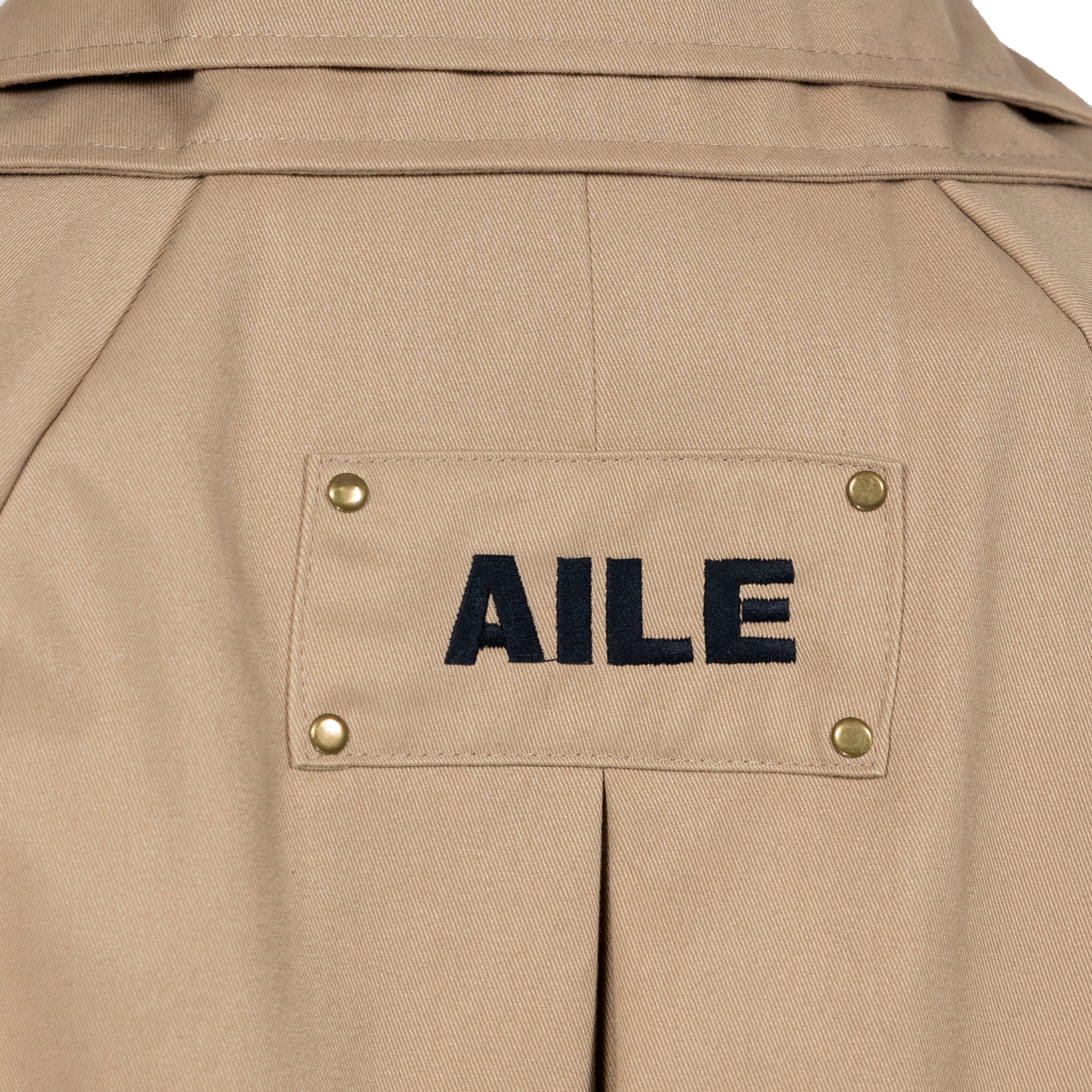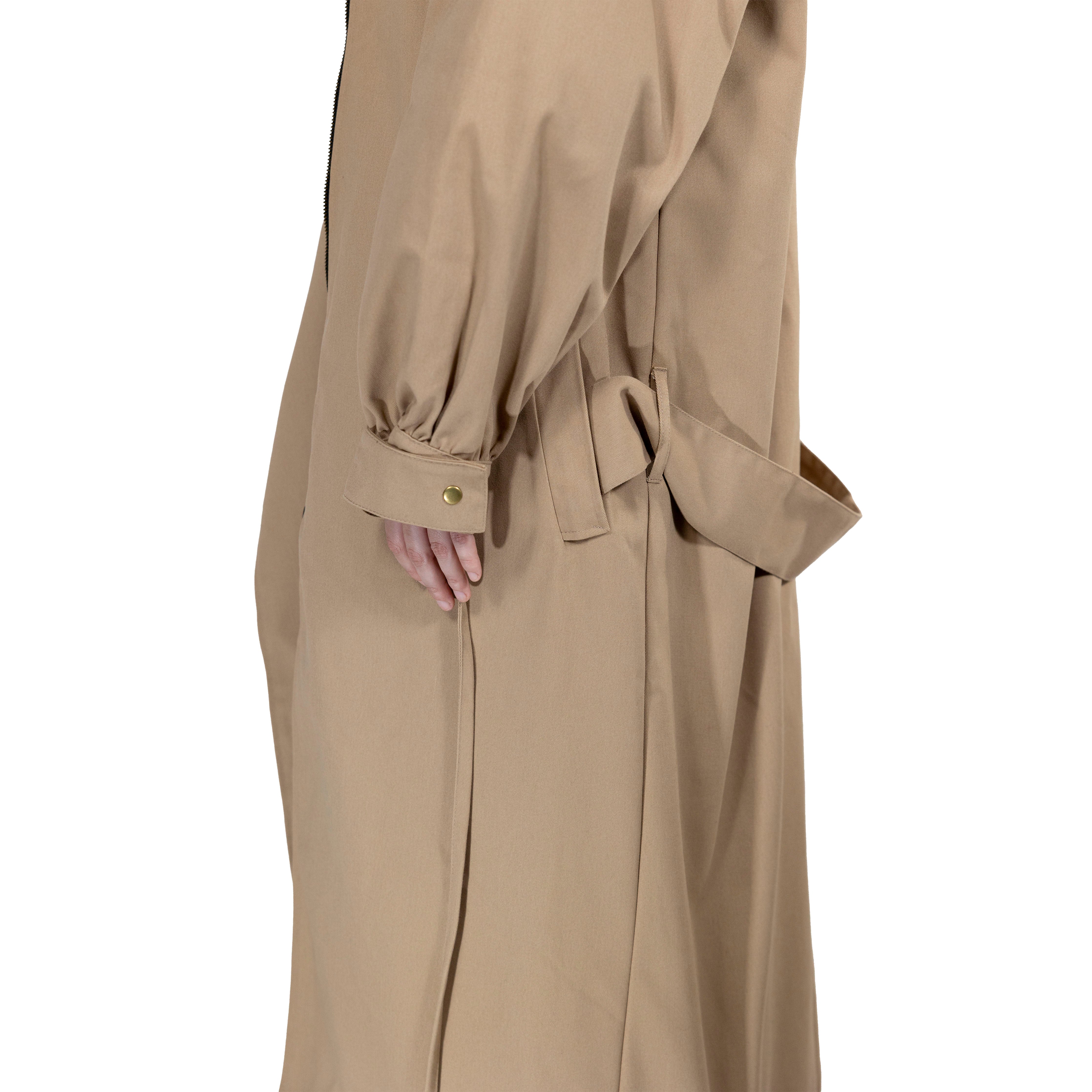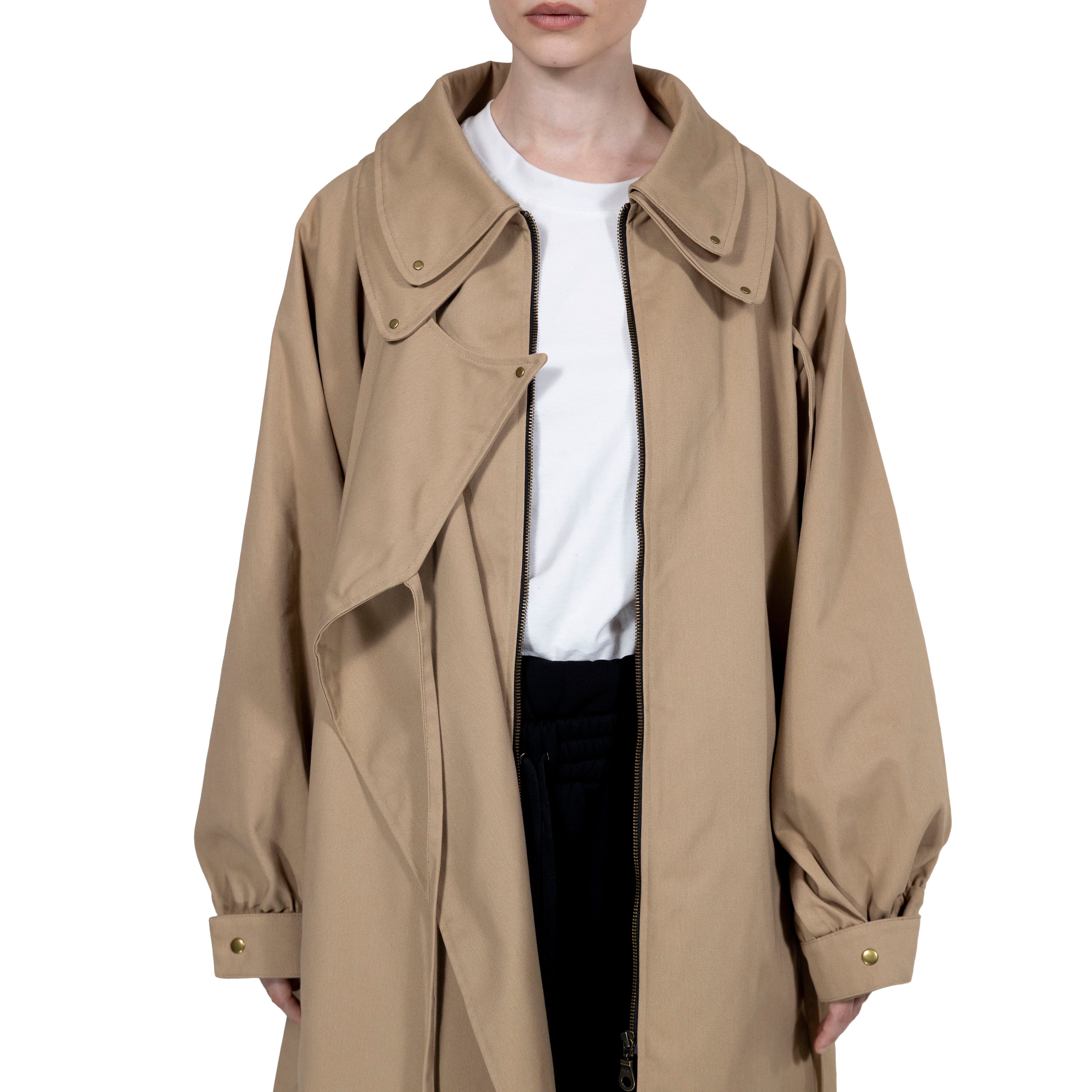 Beige long trench coat with adjustable sleeves and embroidered pleat on the back.