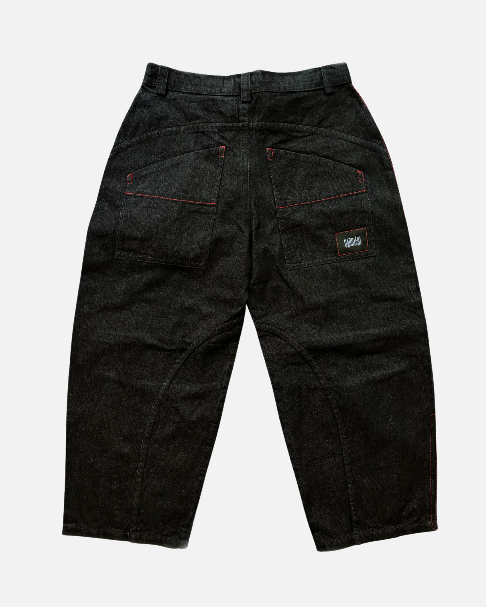 - Black baggy-fit pants made of cotton denim with red detailing. Waist with adjustable tie and pleats, side and back pockets.