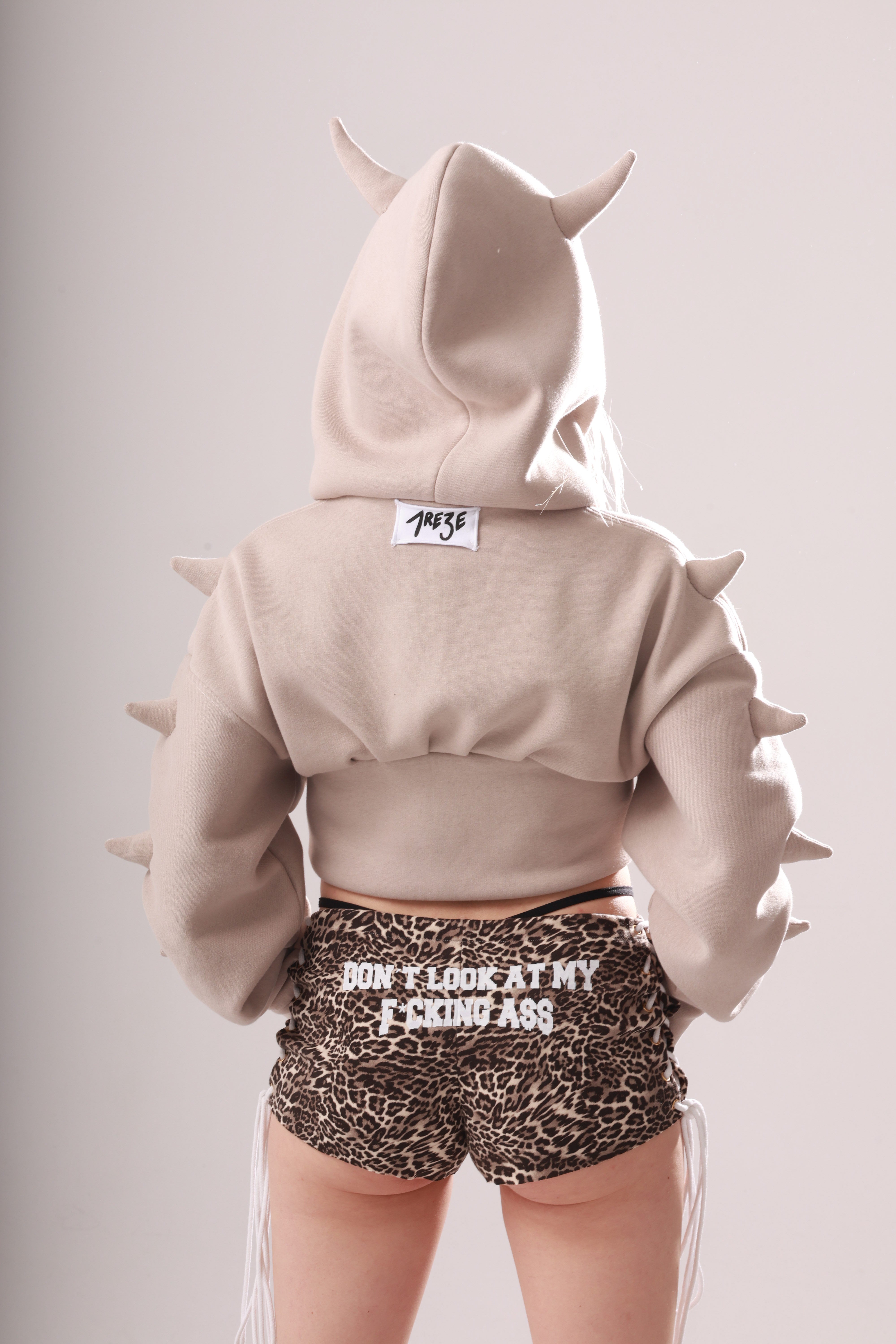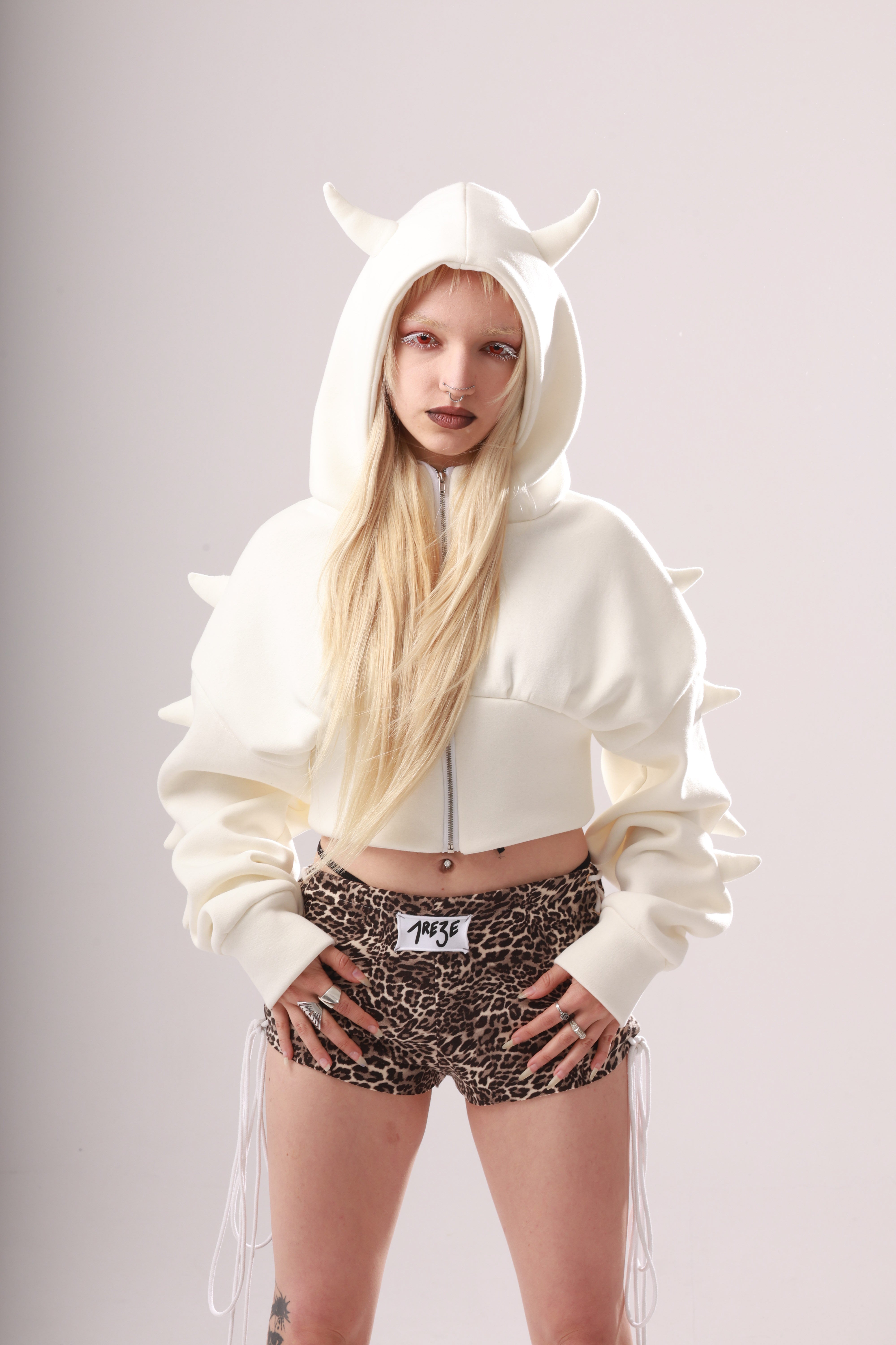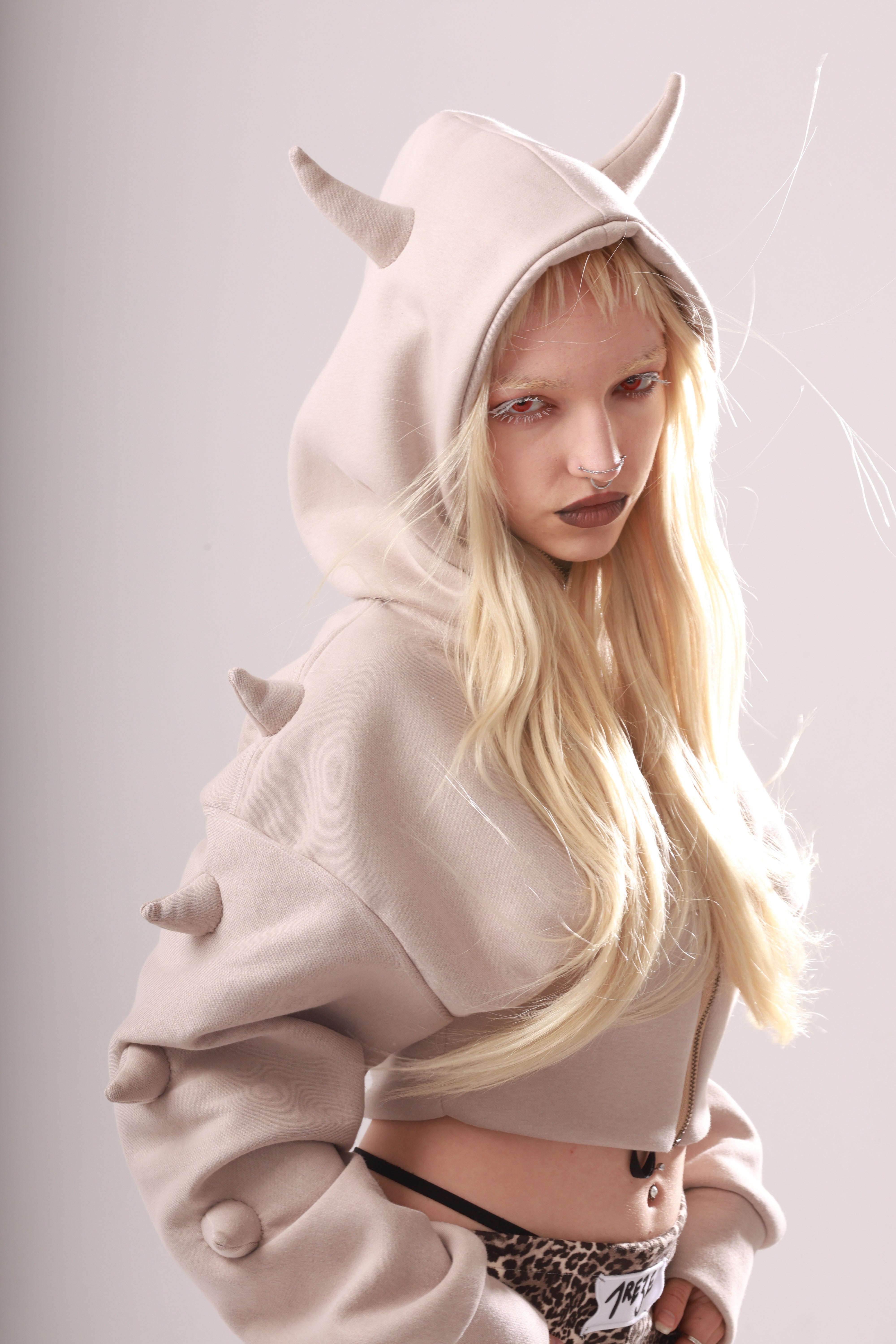 Cropped hoodie with 10 hand-stitched little horns for souls that don’t ask for permission. Features a zipper, oversized fit, and fitted sleeves.