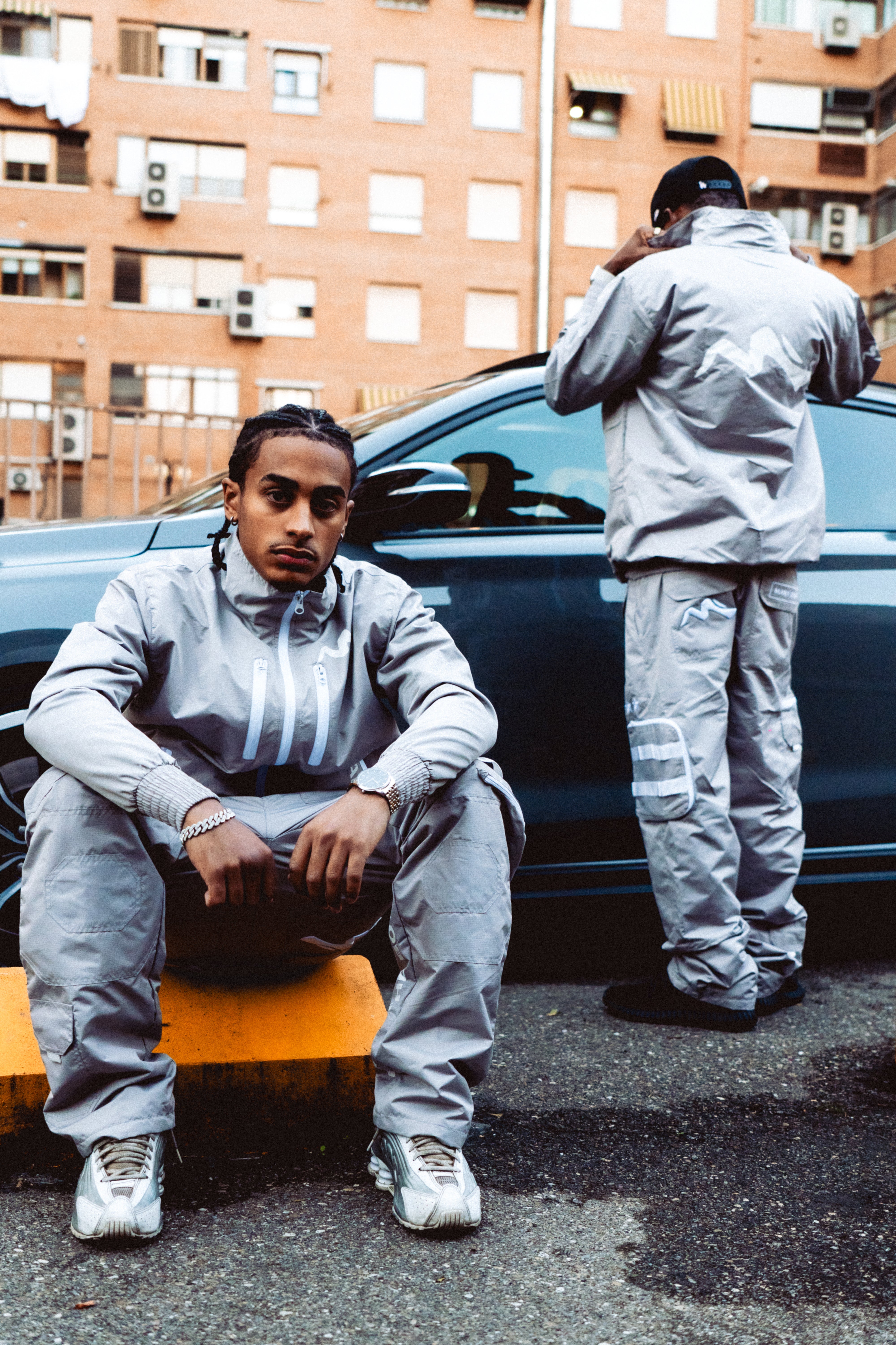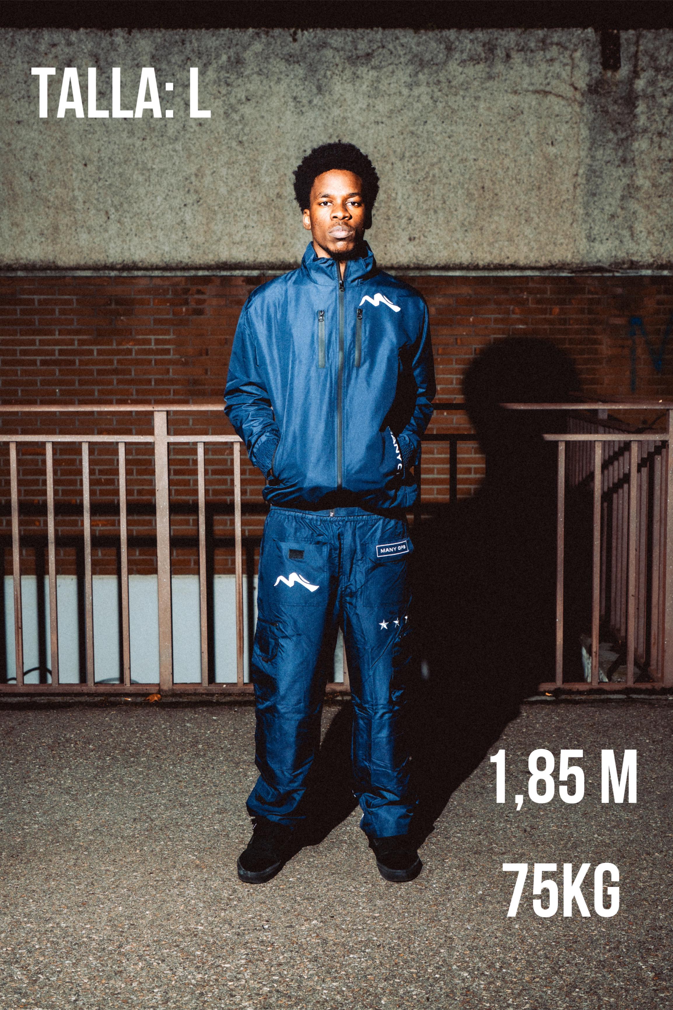 The model wearing the blue tracksuit is 1.85m tall, weighs 75kg, and wears a size L.
