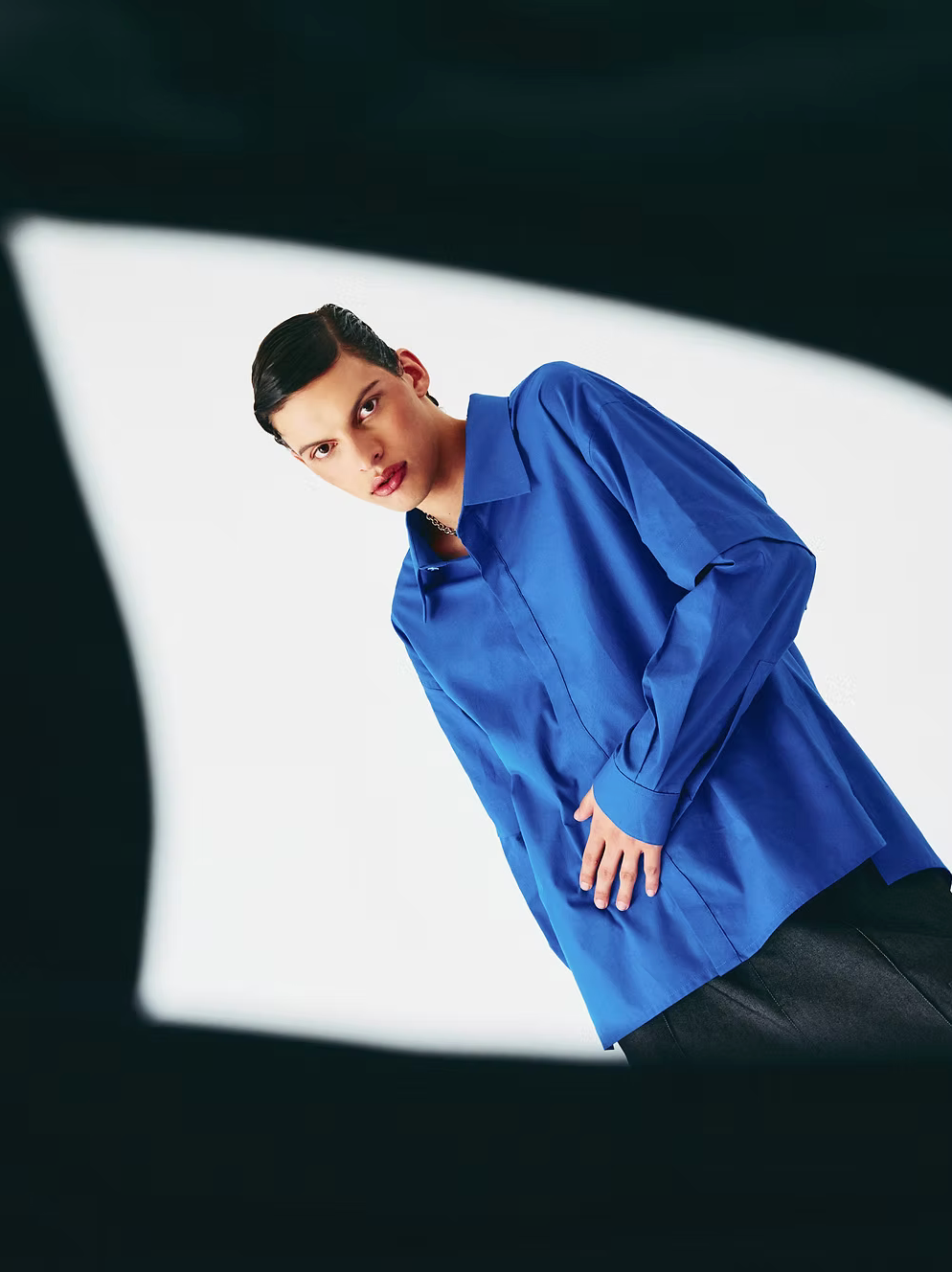 - Long-sleeve black shirt with a relaxed and oversized fit, made from stretch poplin, featuring a hidden button placket and a back cut-out with gathered yoke.