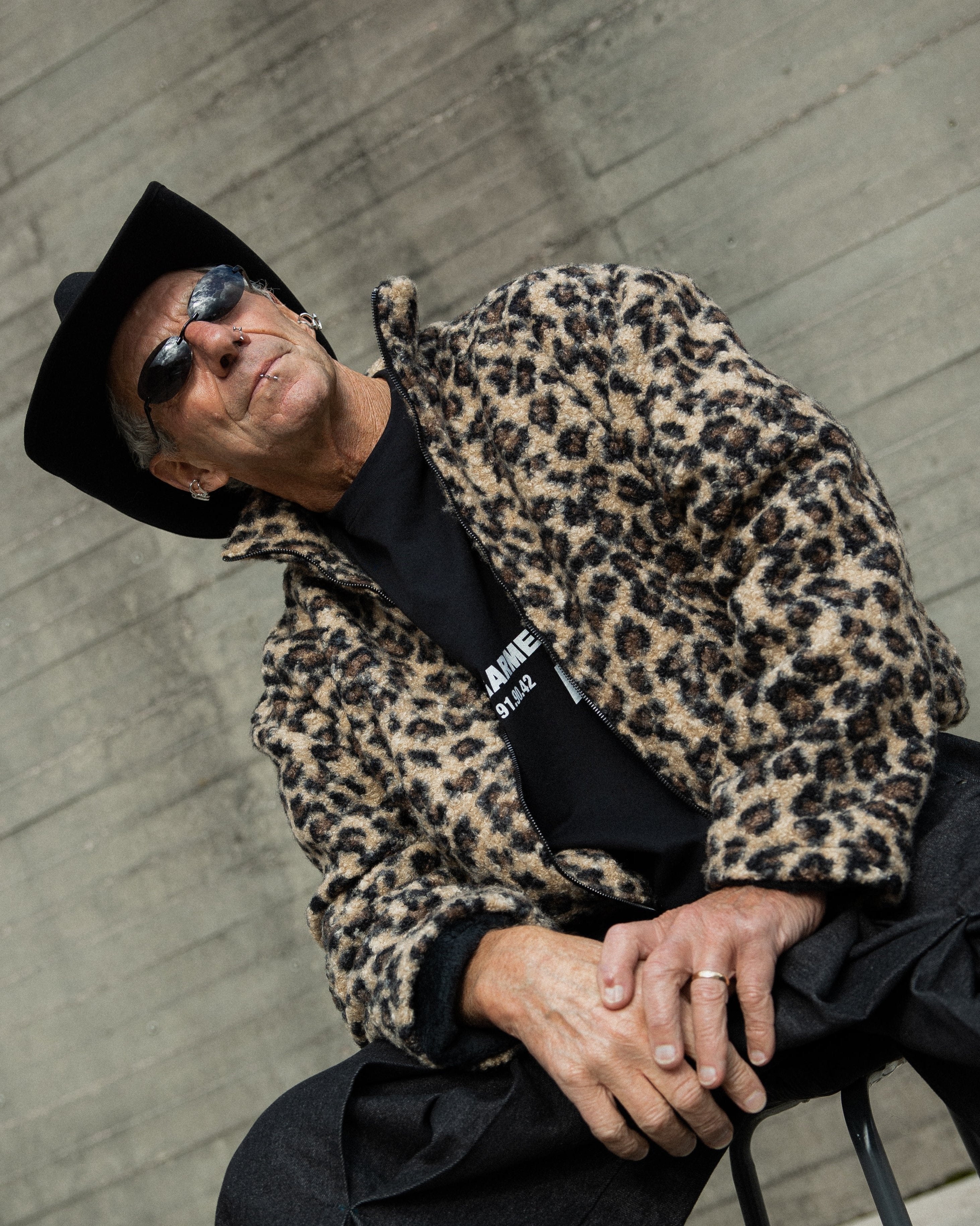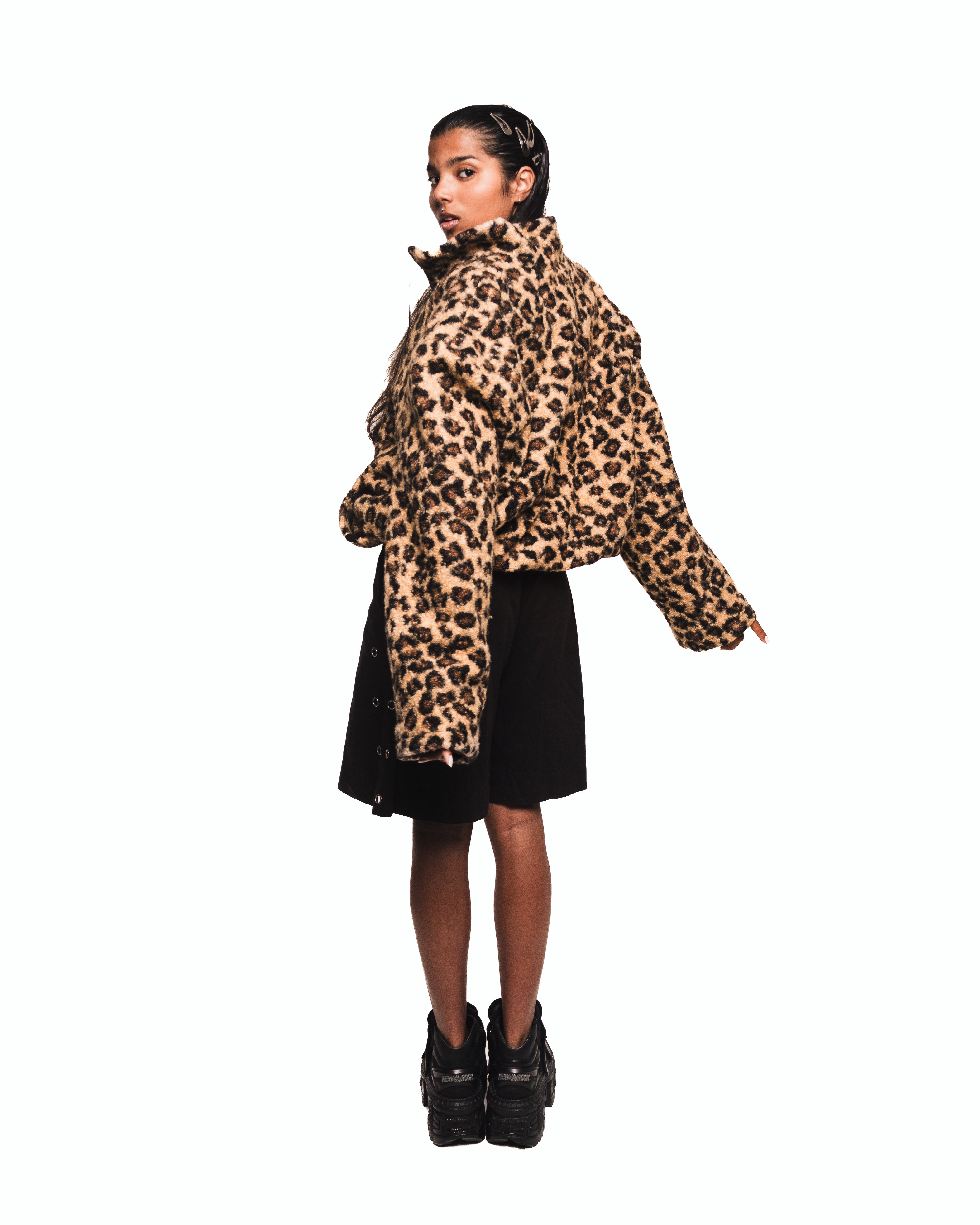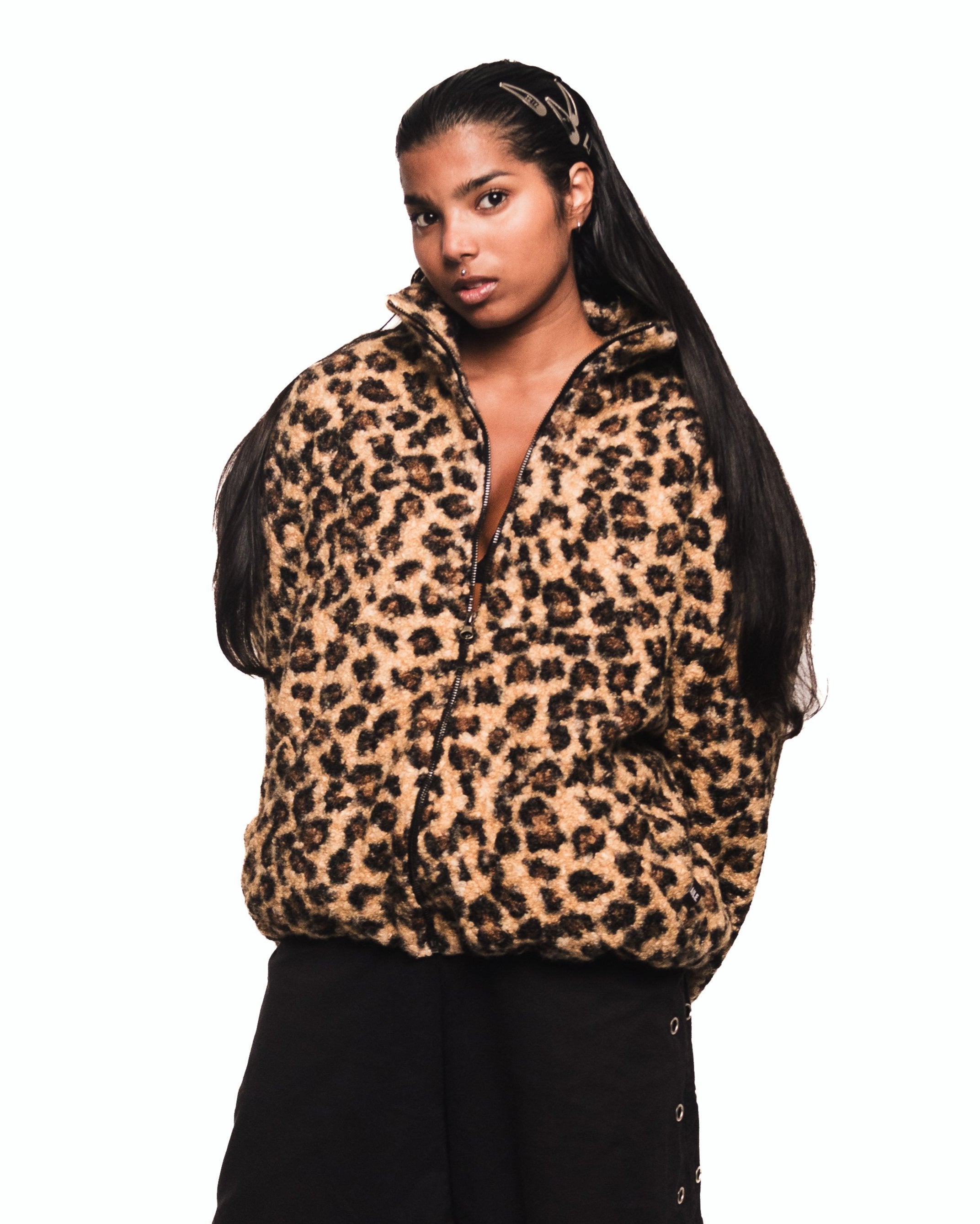 Long-sleeve fleece jacket with a leopard print and black faux-fur lining on the inside. Features a black front zipper, front pockets with brand label, and an adjustable waistband with inner elastic and toggles.