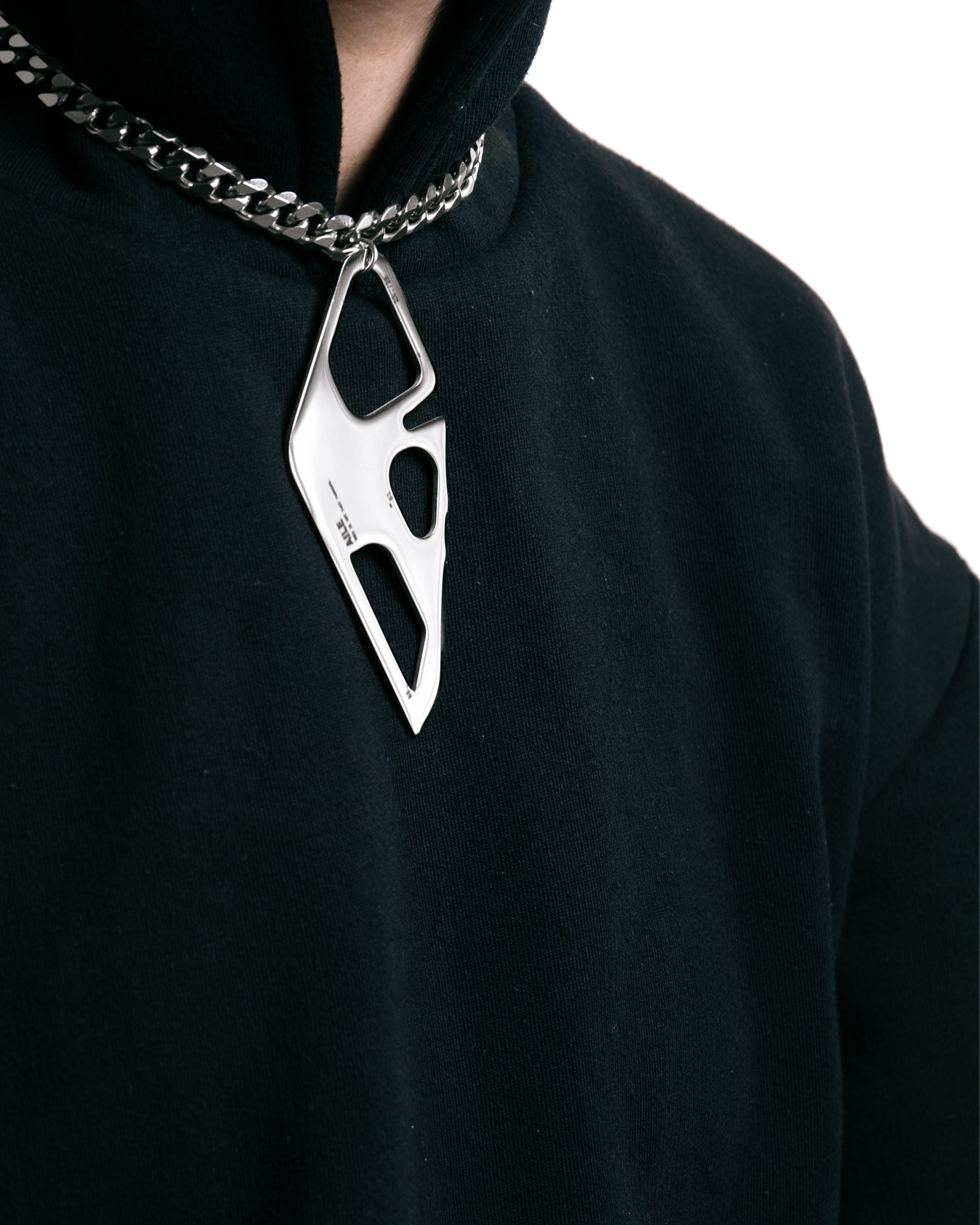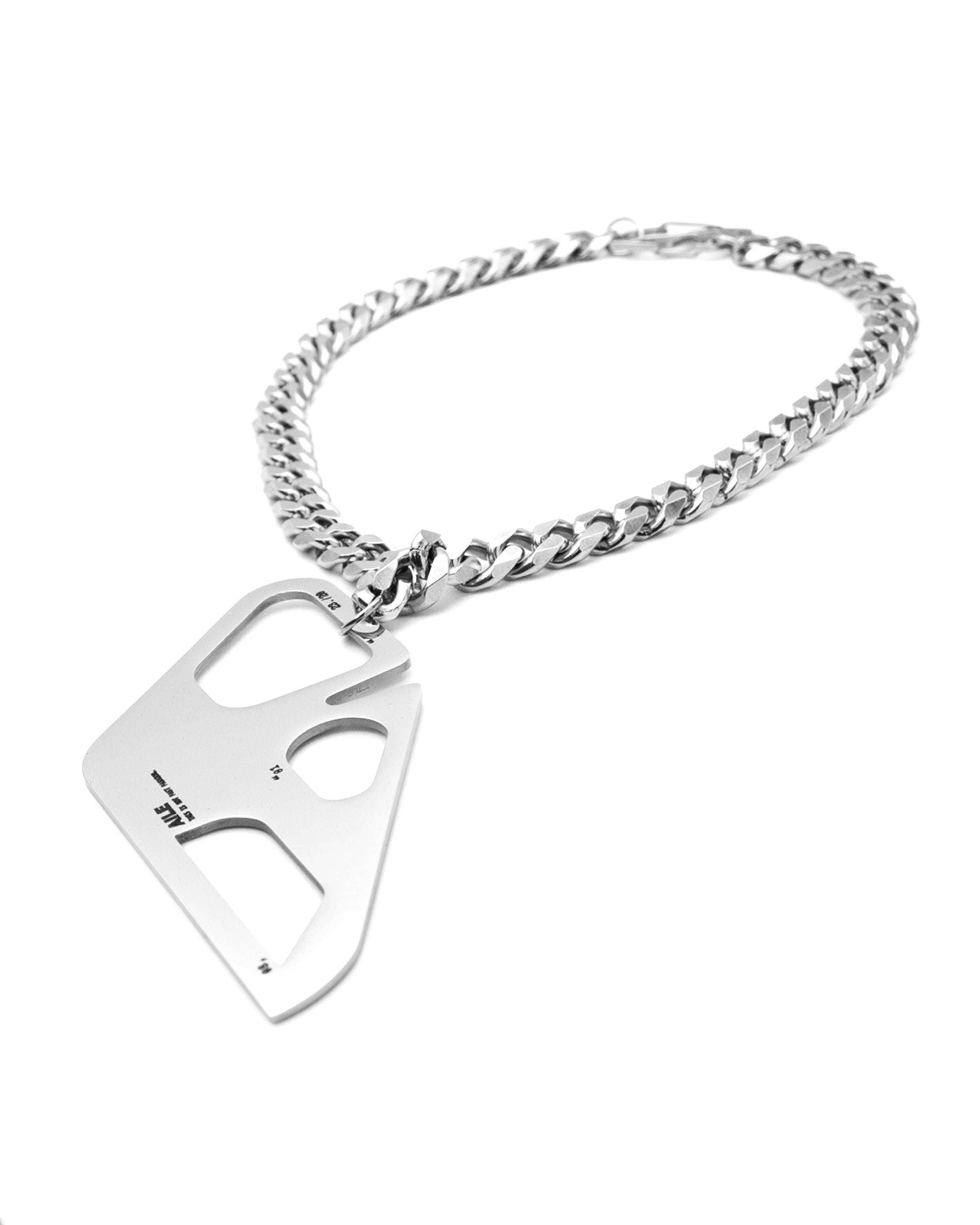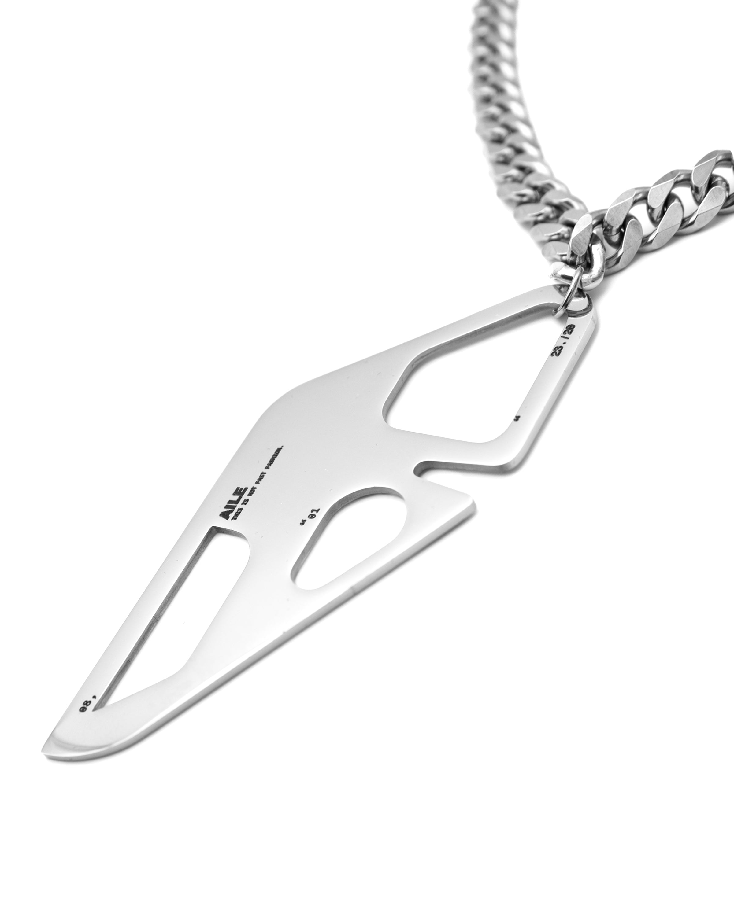 Stainless steel chain necklace with large central charm with laser engraved AILE logo.