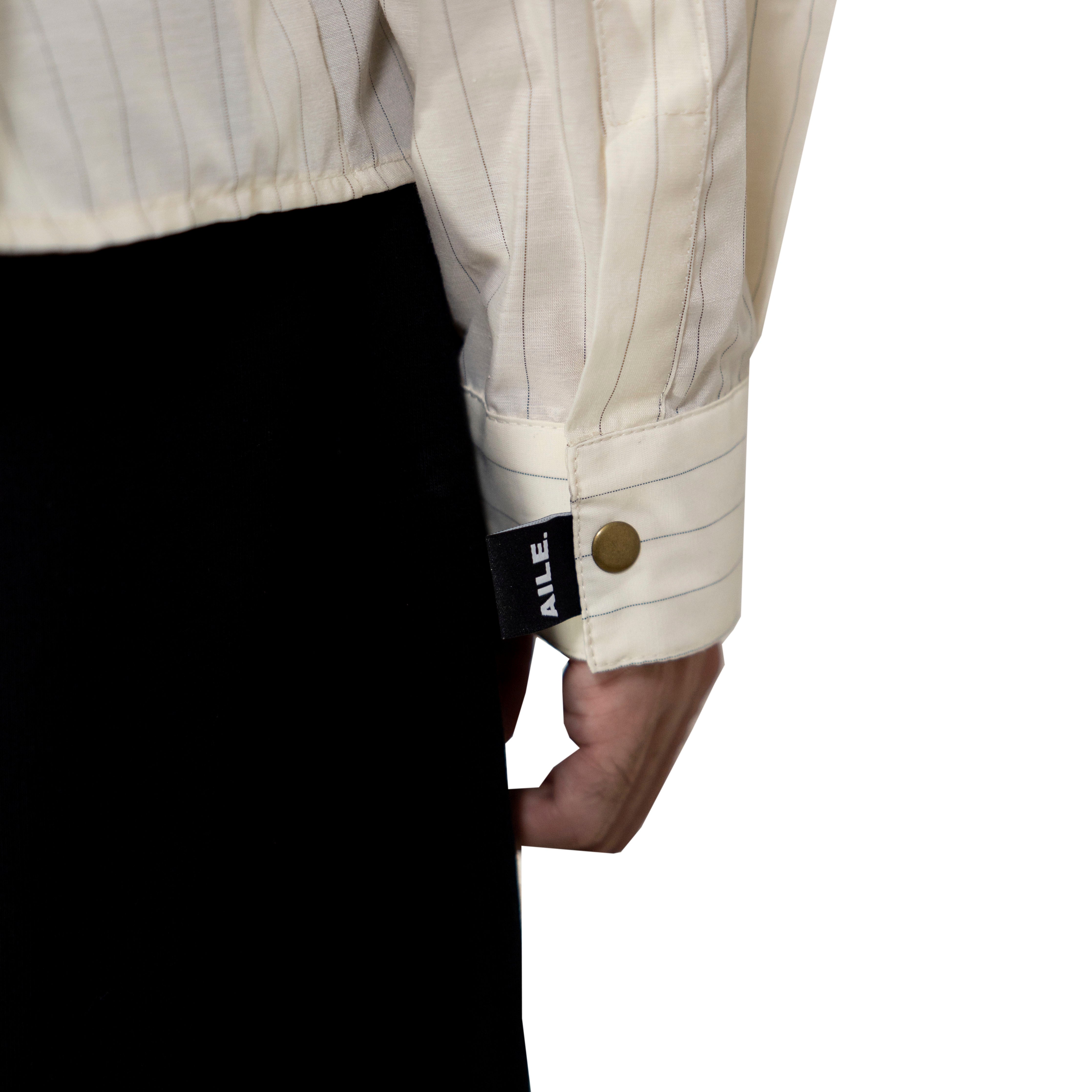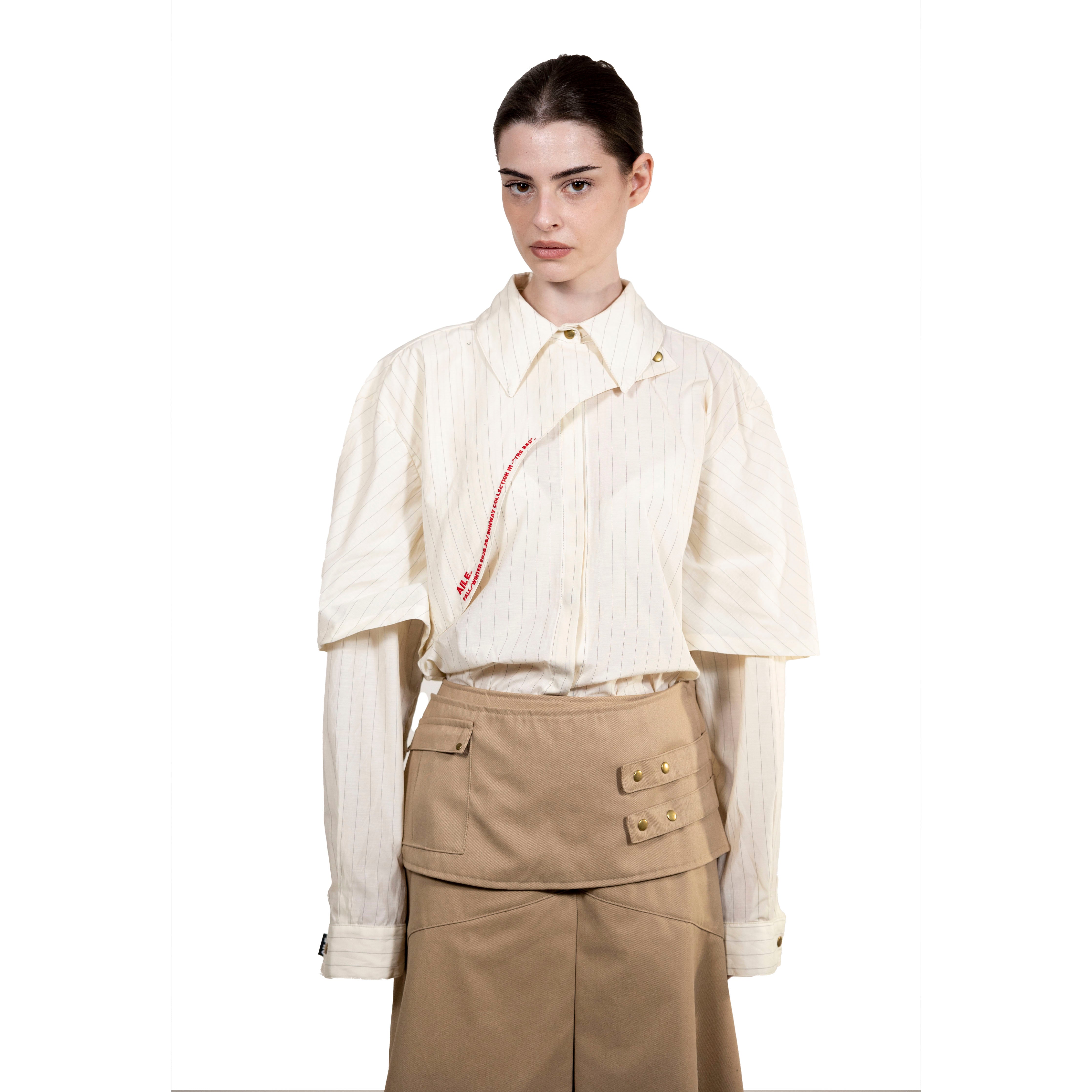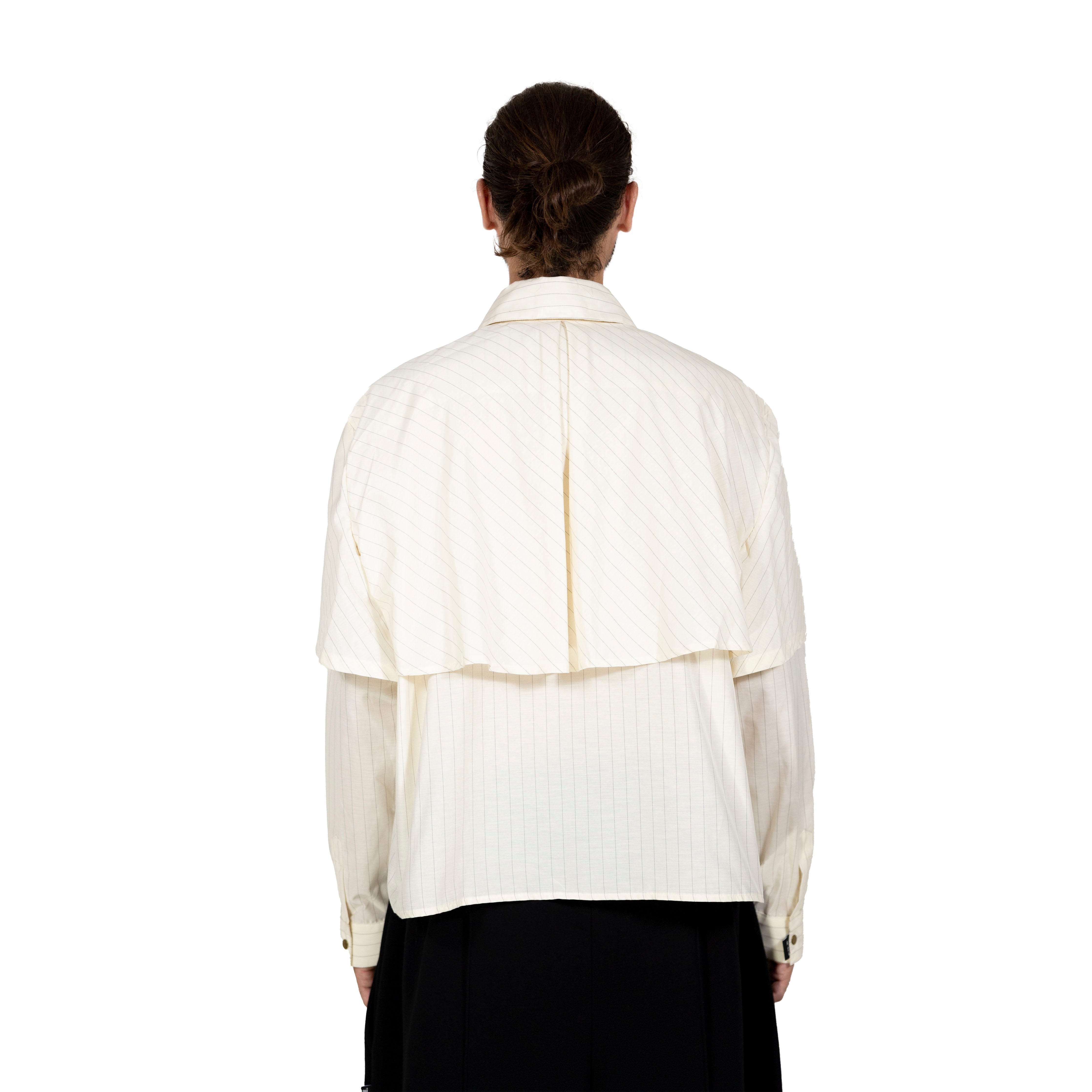 Long-sleeved striped shirt. Double sleeves and cape on the back and chest. Red embroidery on the chest. Hidden buttons