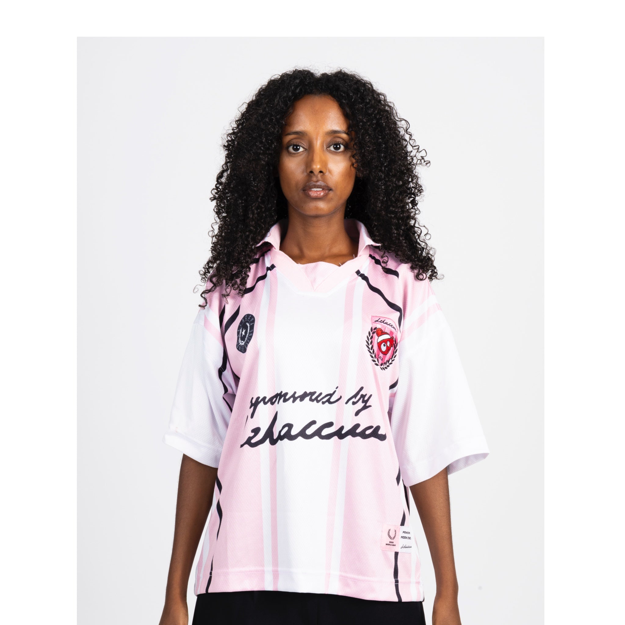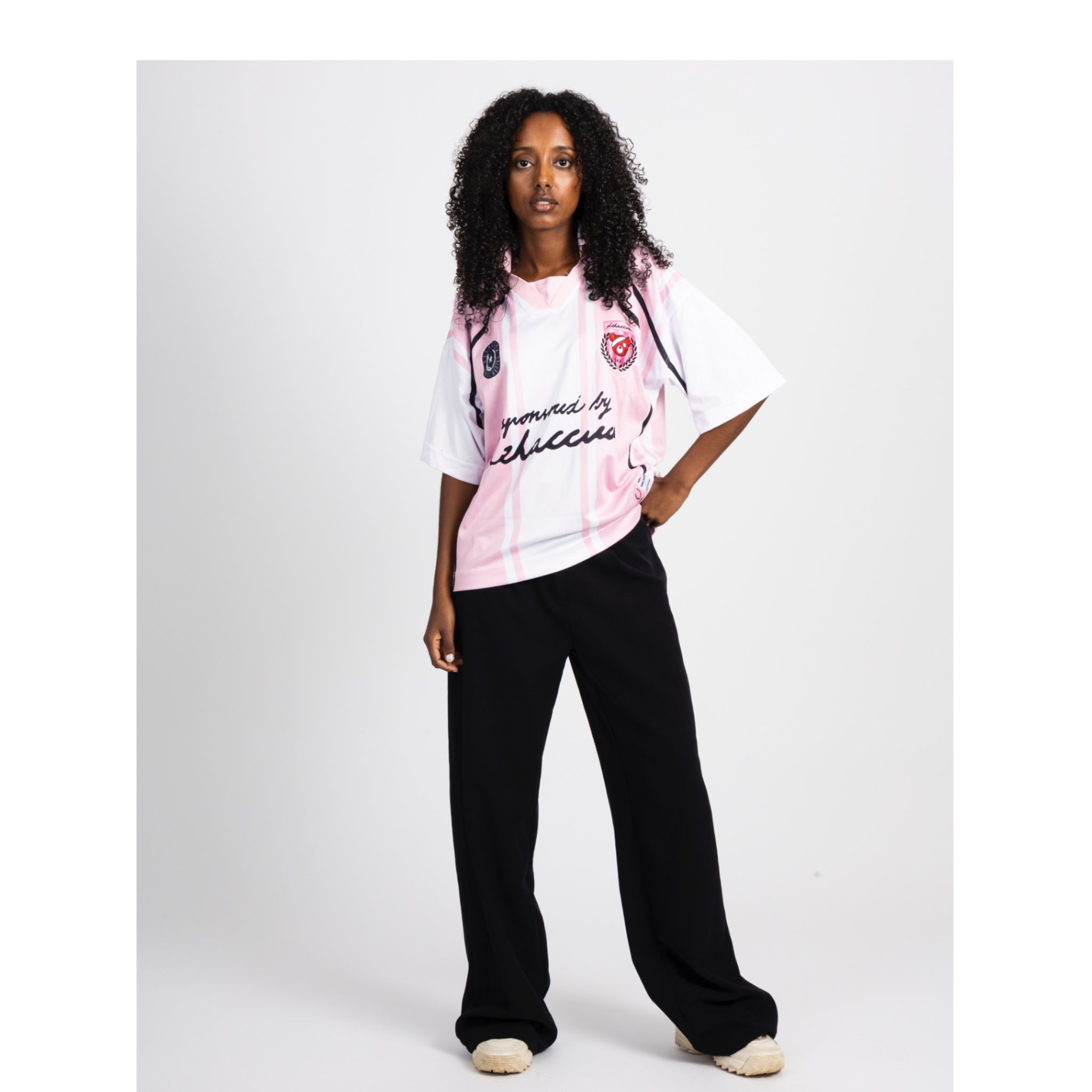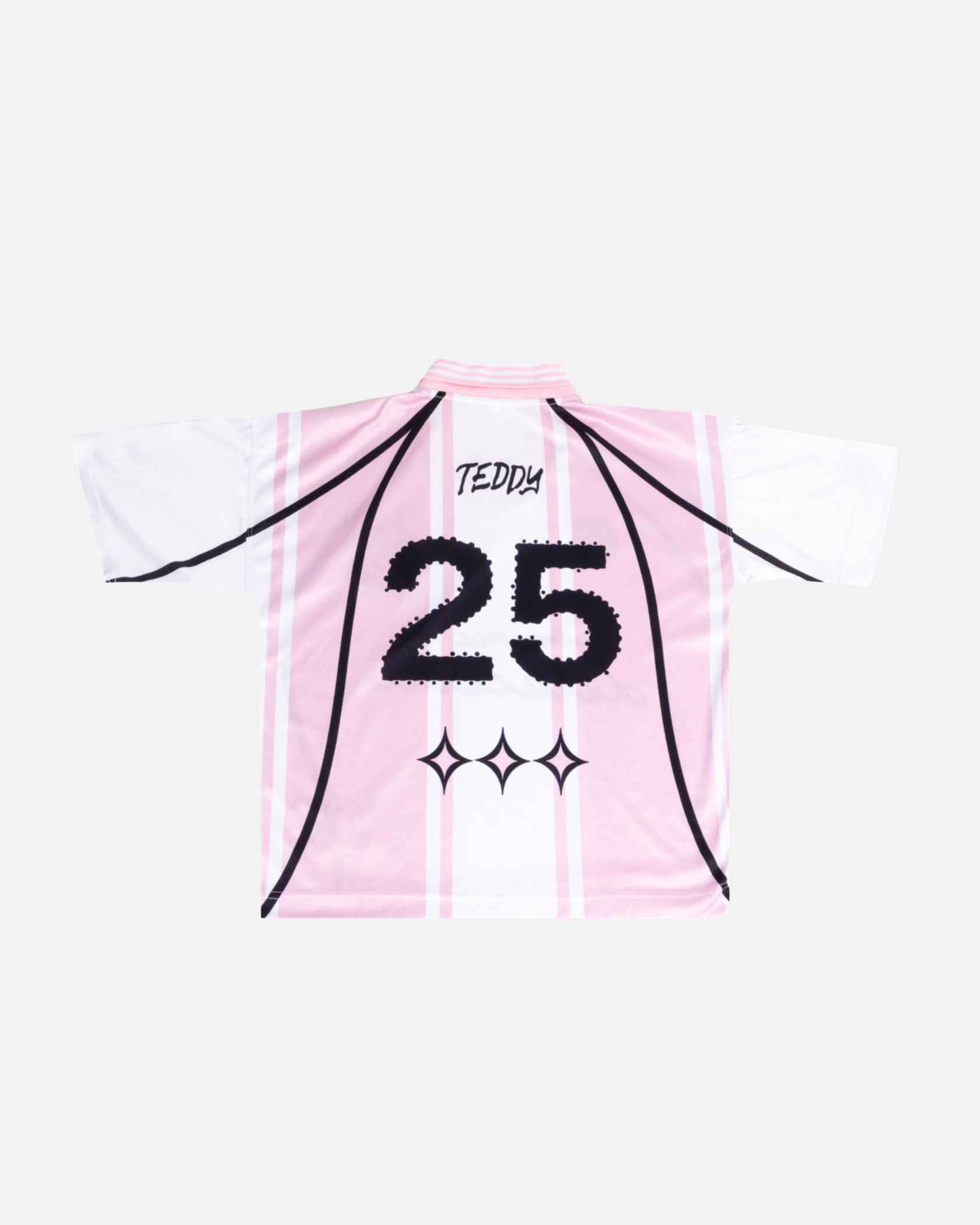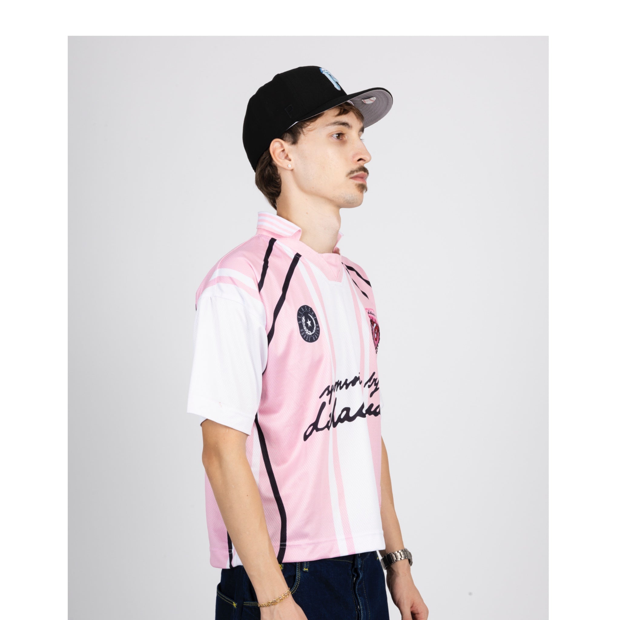 Football shirt, printed in pink DTF. Shield embroidered on the chest and printed on the back.