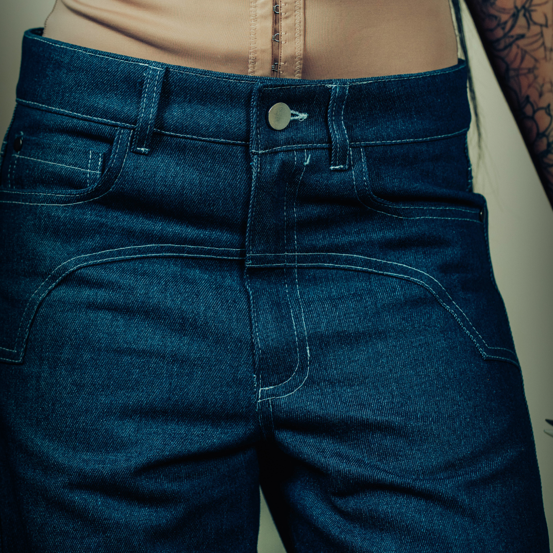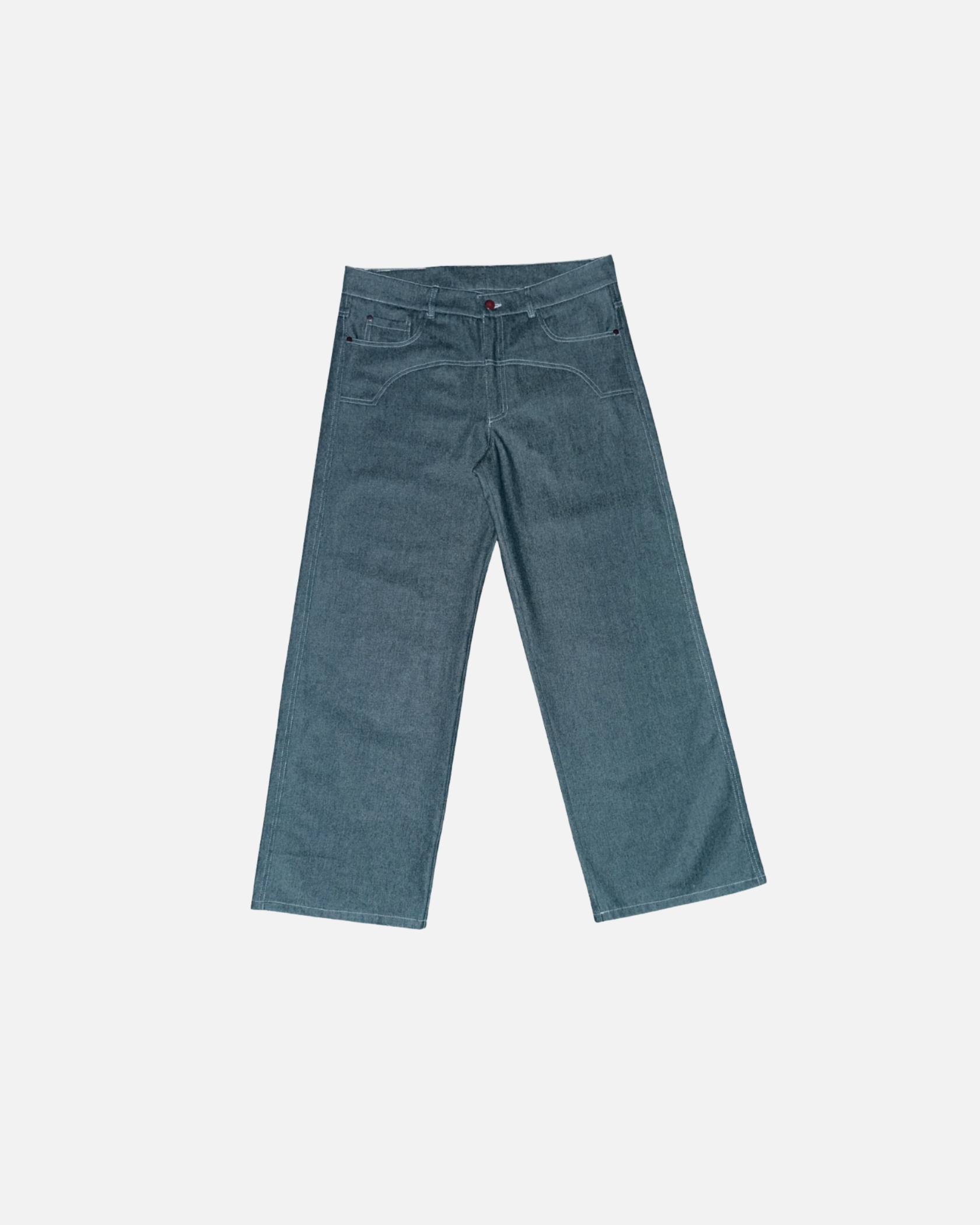 The Temple Pant Girl, 100% cotton raw denim pants with a baggy cut and structured drape. They feature a distinctive front seam and two nearly 30 cm silkscreened back pockets bearing the brand’s initials in neosigilism style, along with the inscription from Exodus 35:31–33.