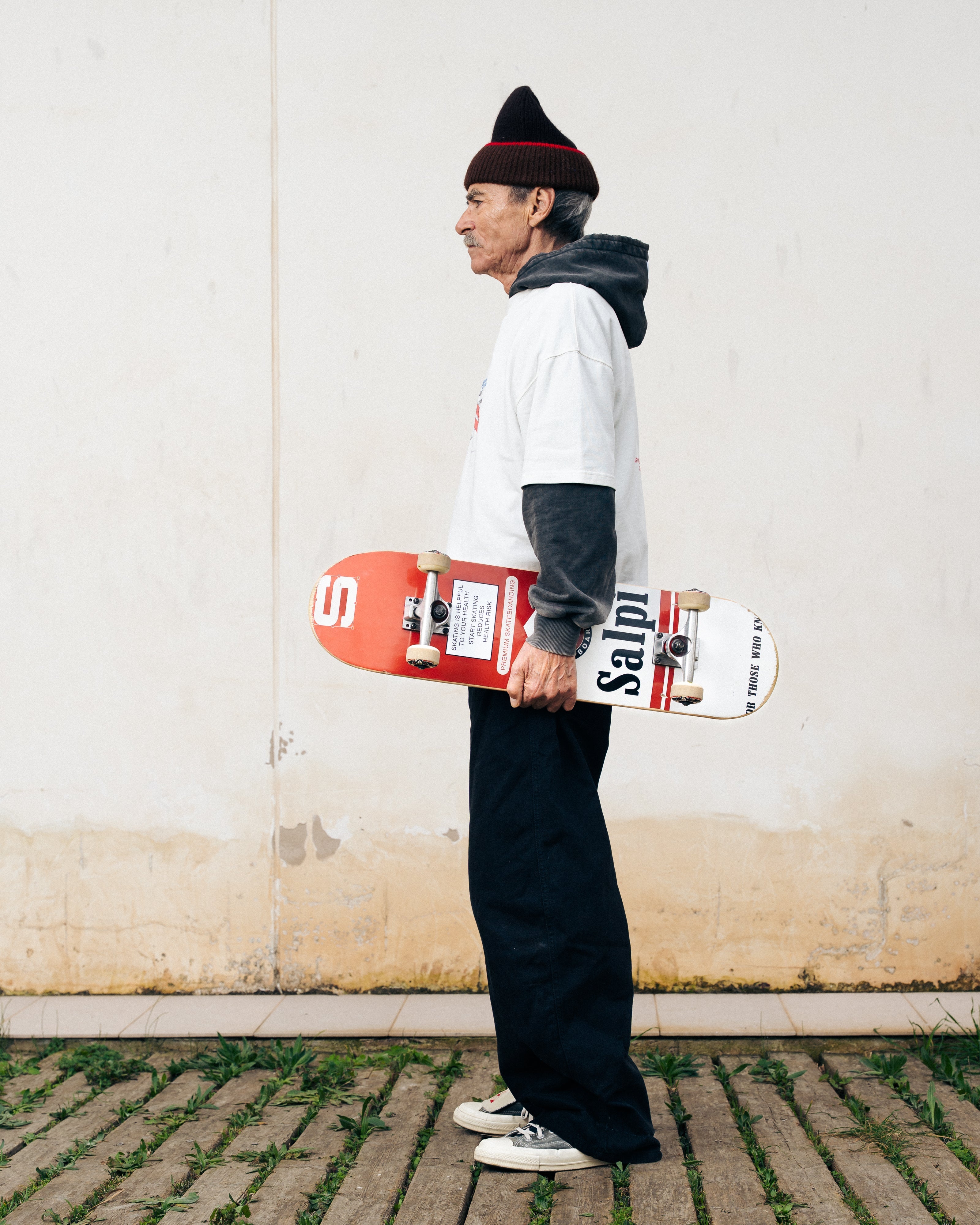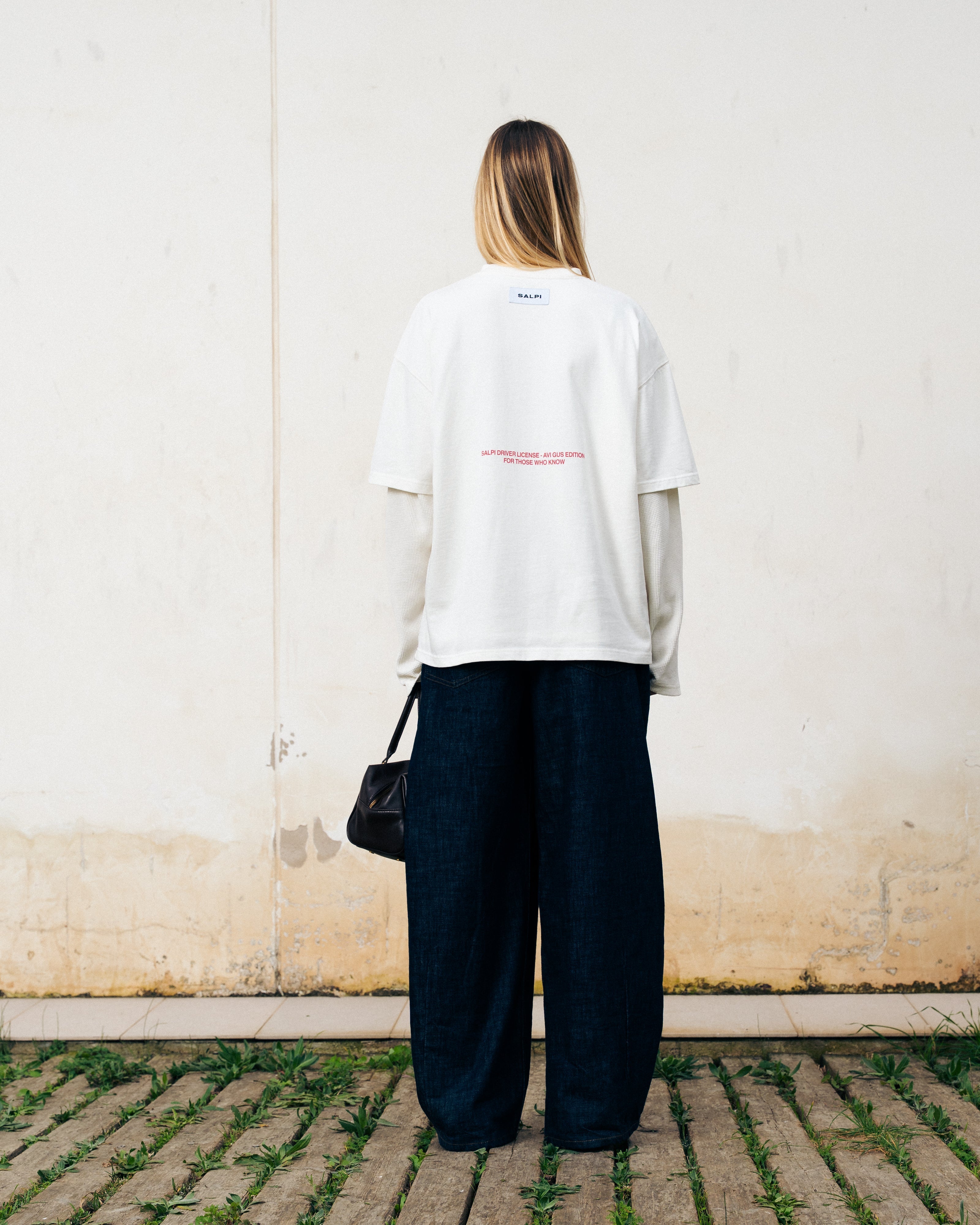 Clean white T-shirt with a square fit. On the chest, Avi Gus's ID. On the back, minimal typographic detail in red to finish off without overloading.