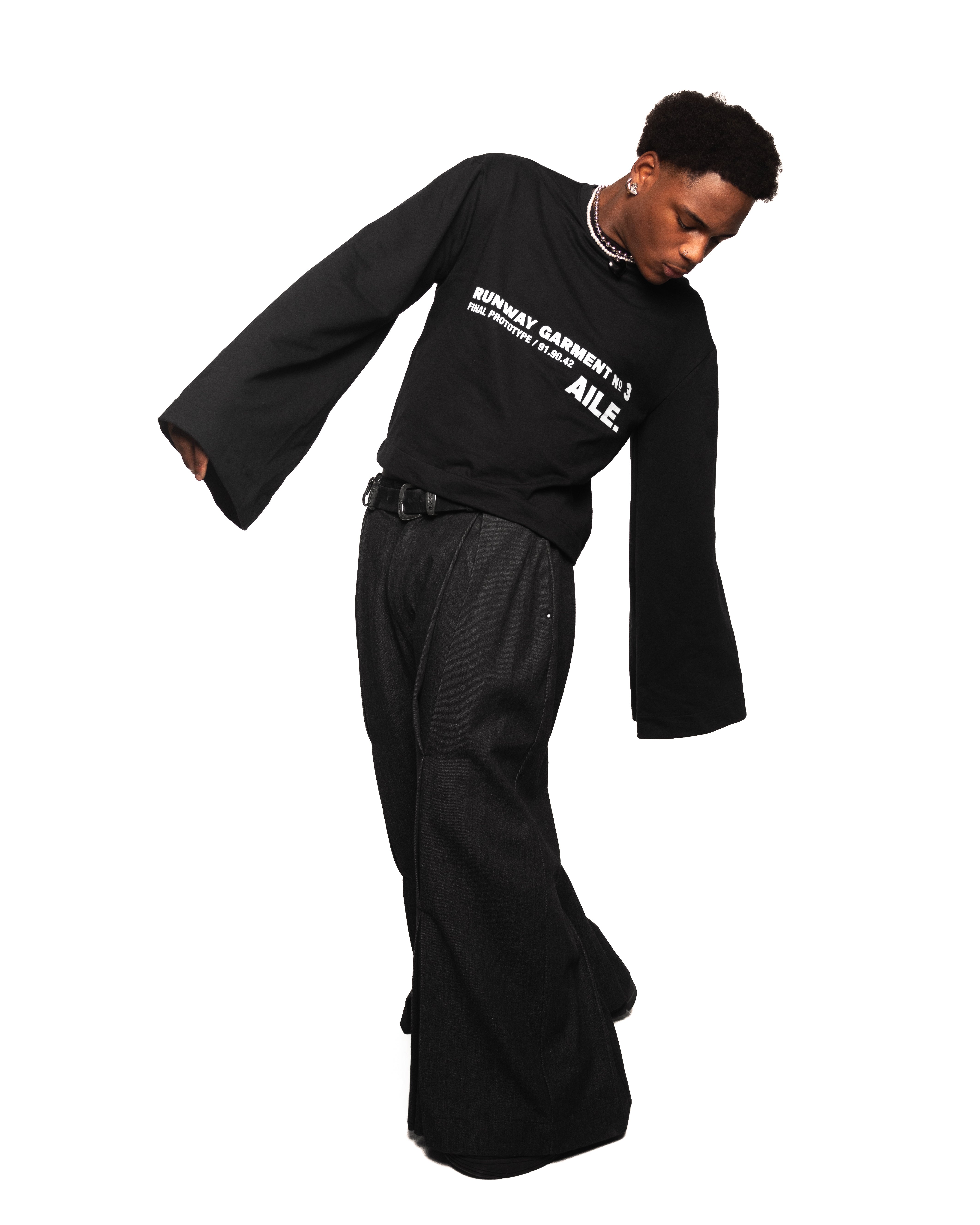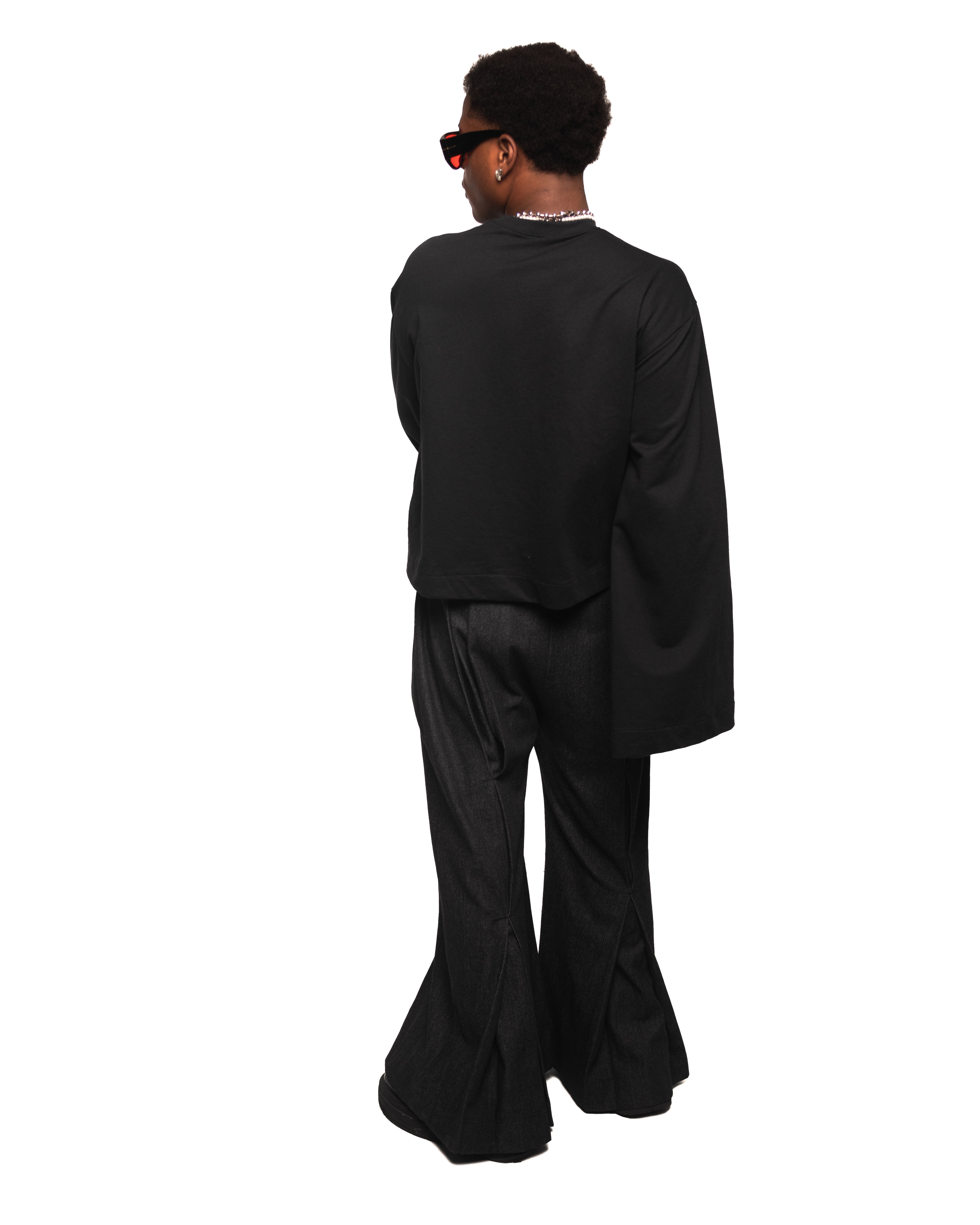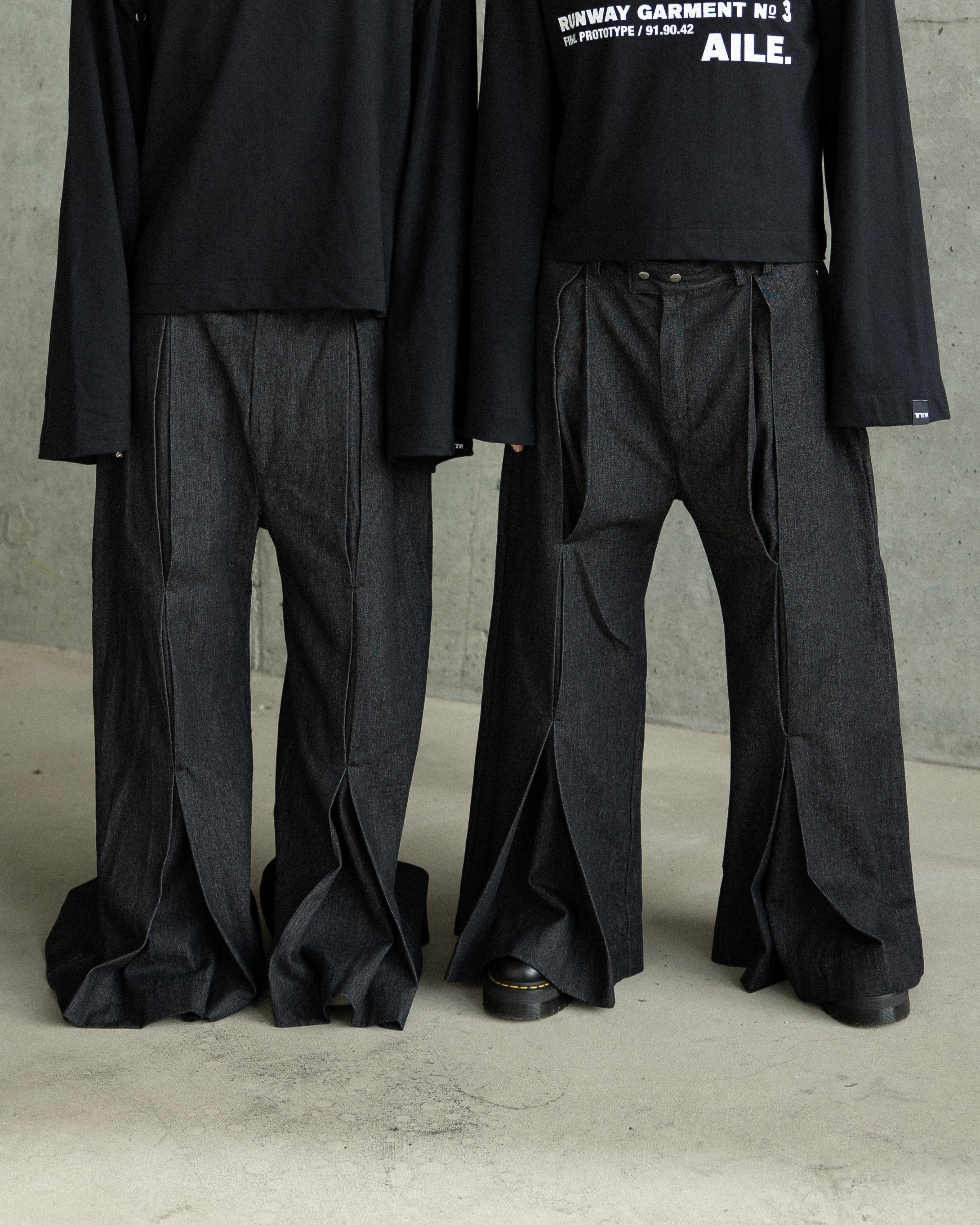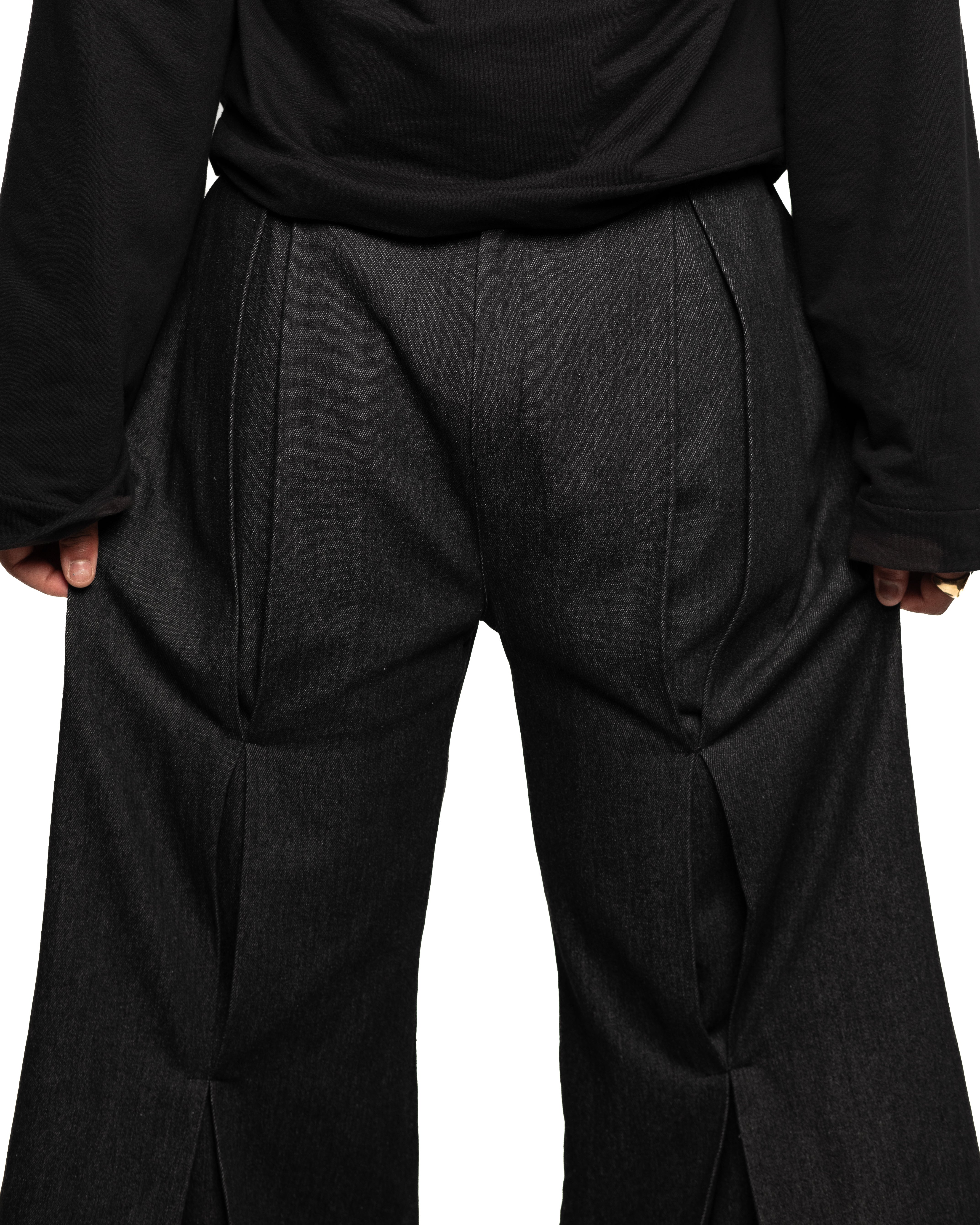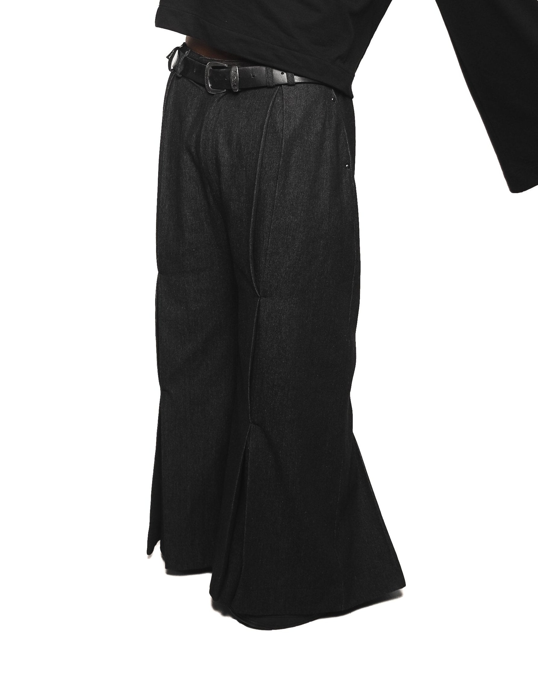 Long black denim pants with vertical pleats on the front and back, side pockets, belt loops, and a zip closure with two snap buttons.