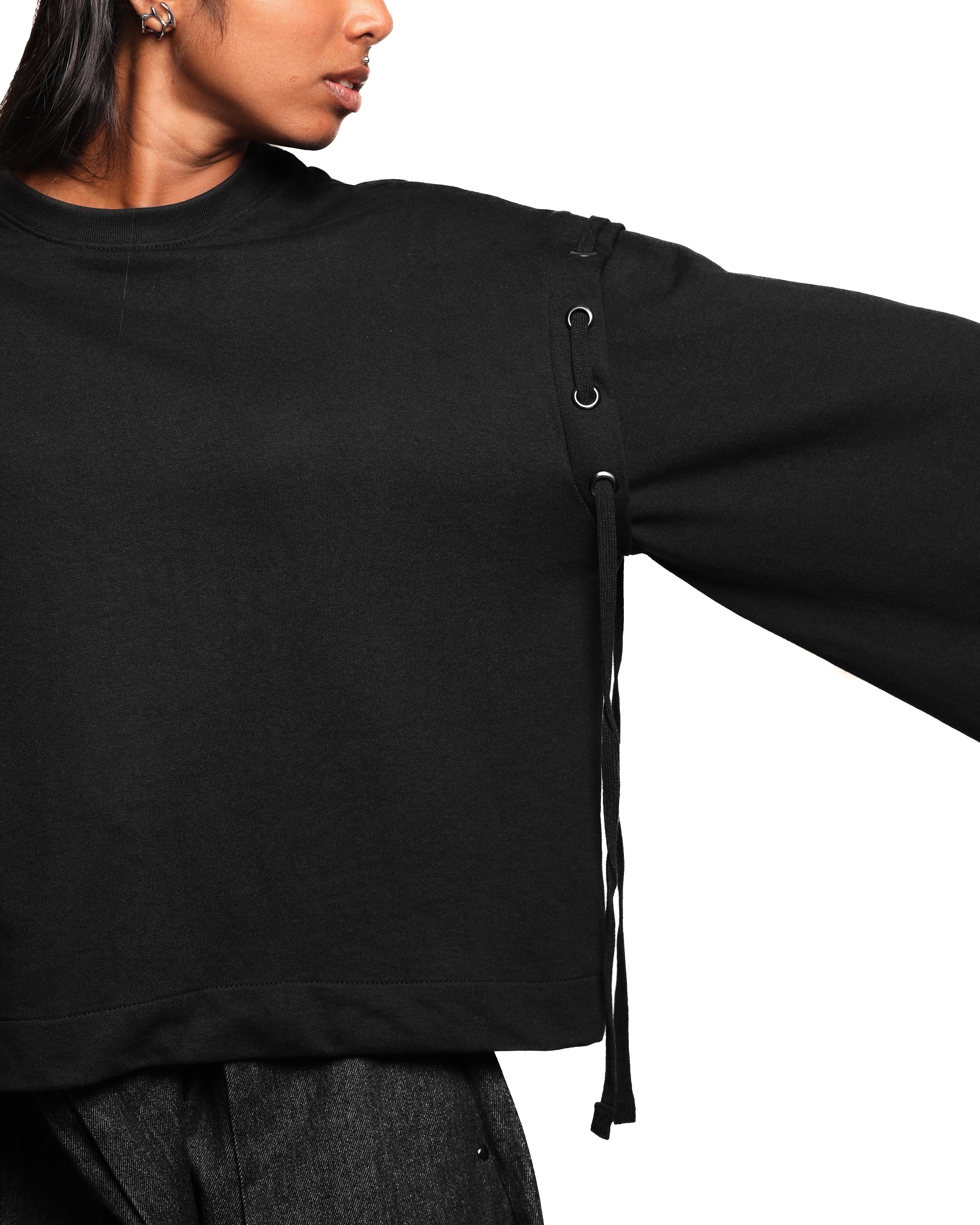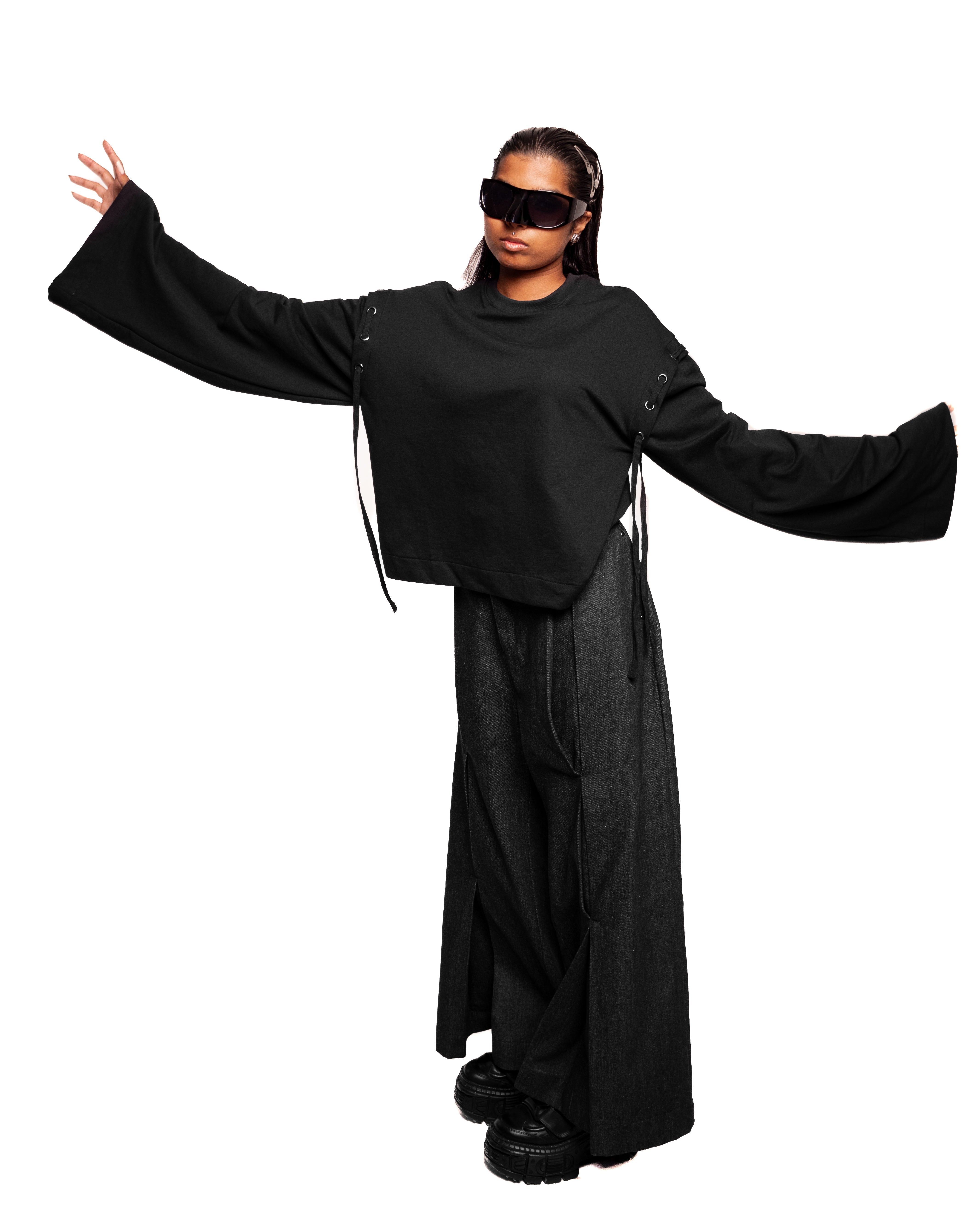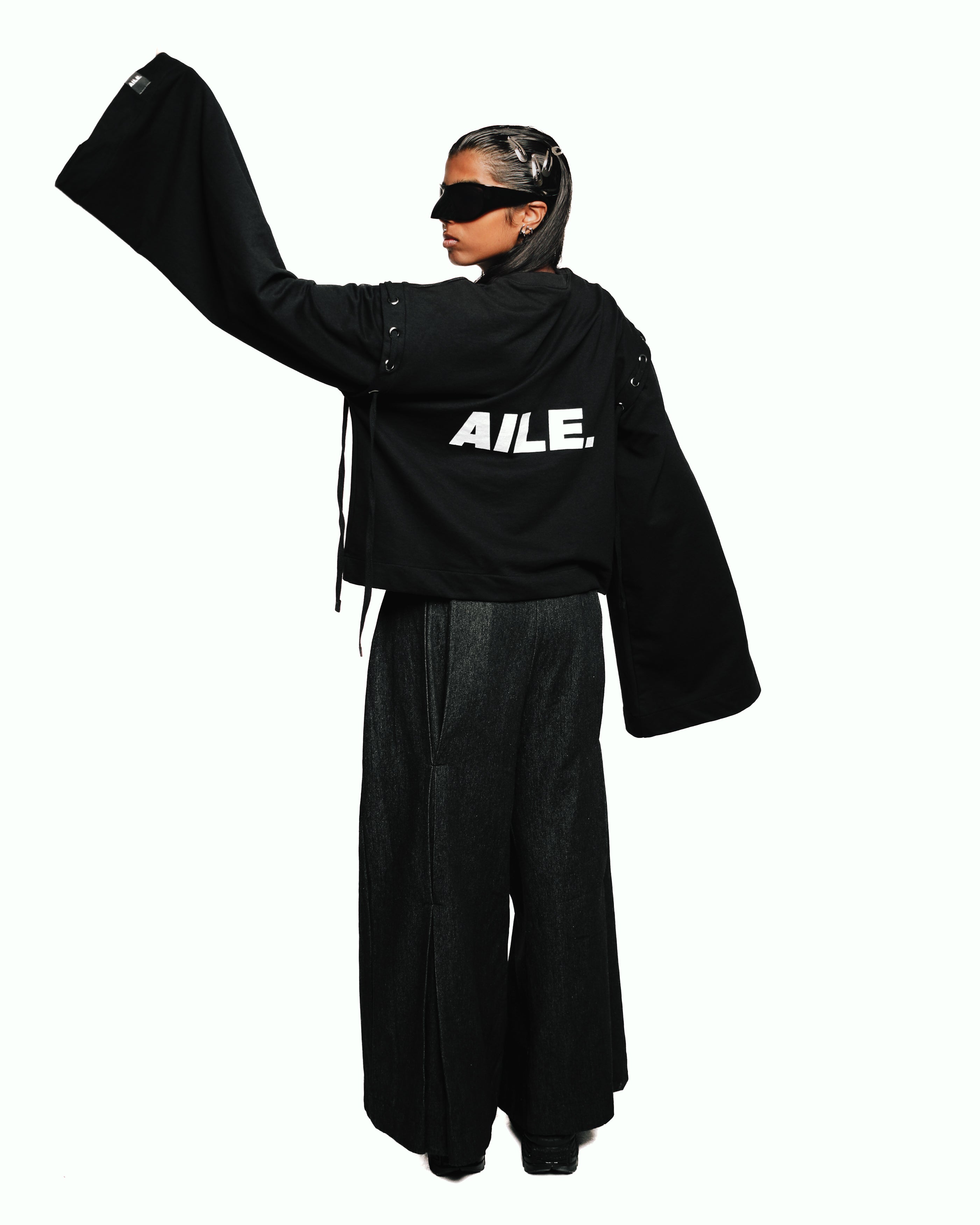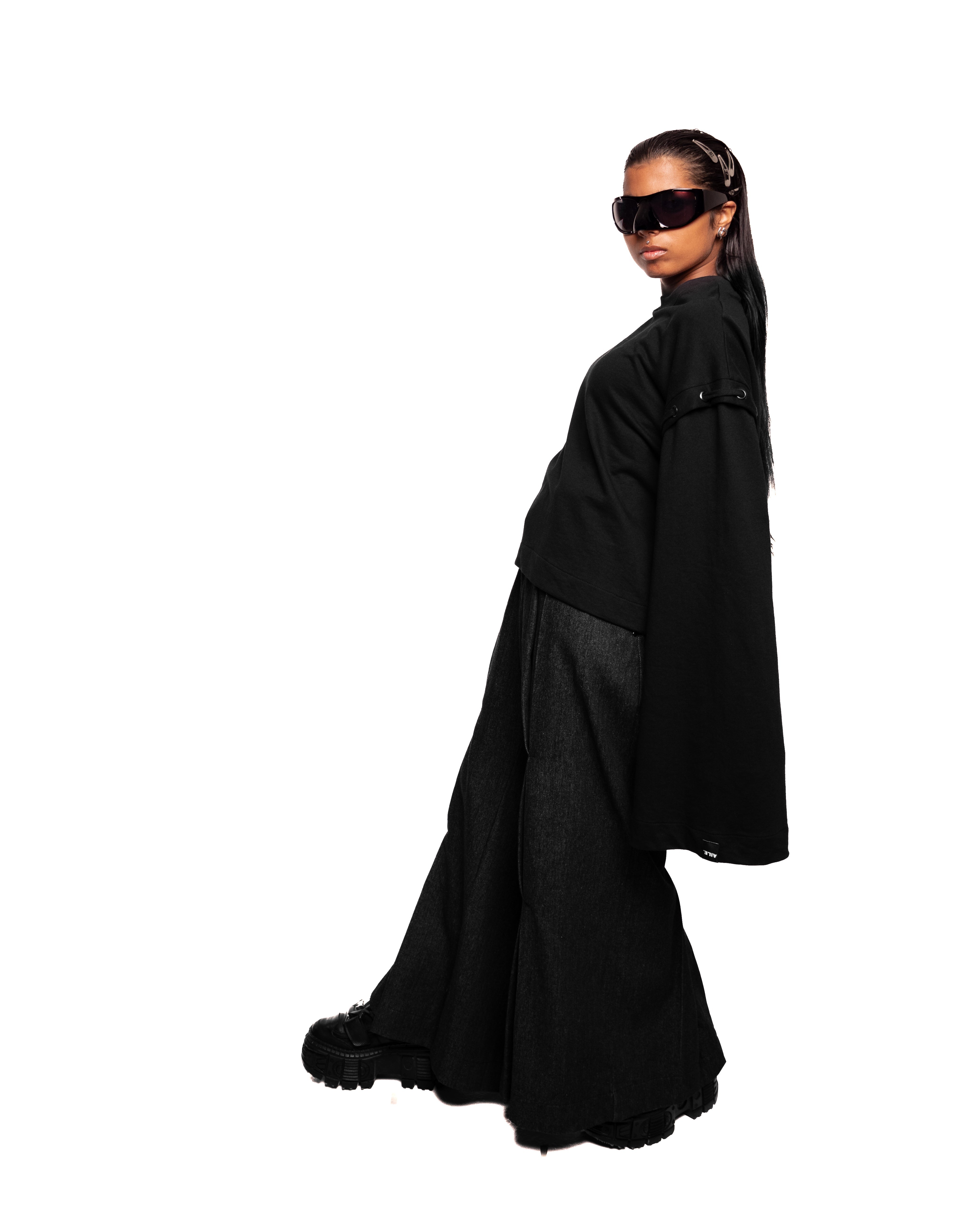 Black t-shirt with a shoulder pad effect over long sleeves. Studs on the shoulder pad with removable cords. White logo on the back, made with high-quality screen printing.